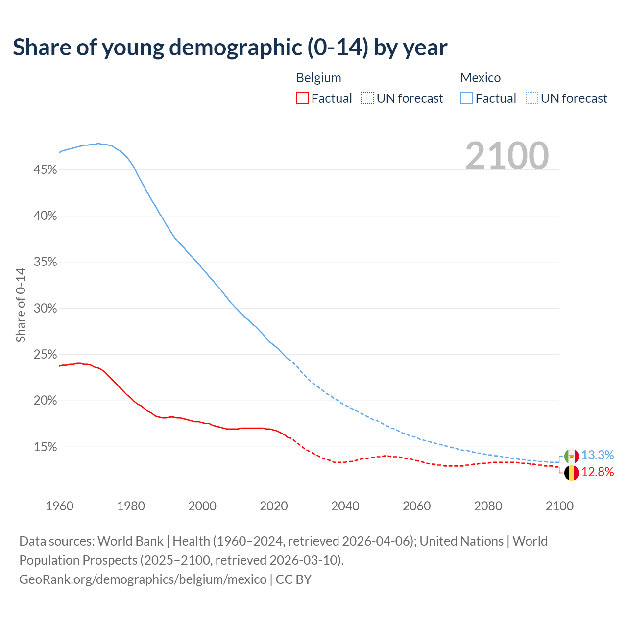 - The share of young demographic (0-15 years old) in Belgium is 16% vs 24.5% in Mexico.