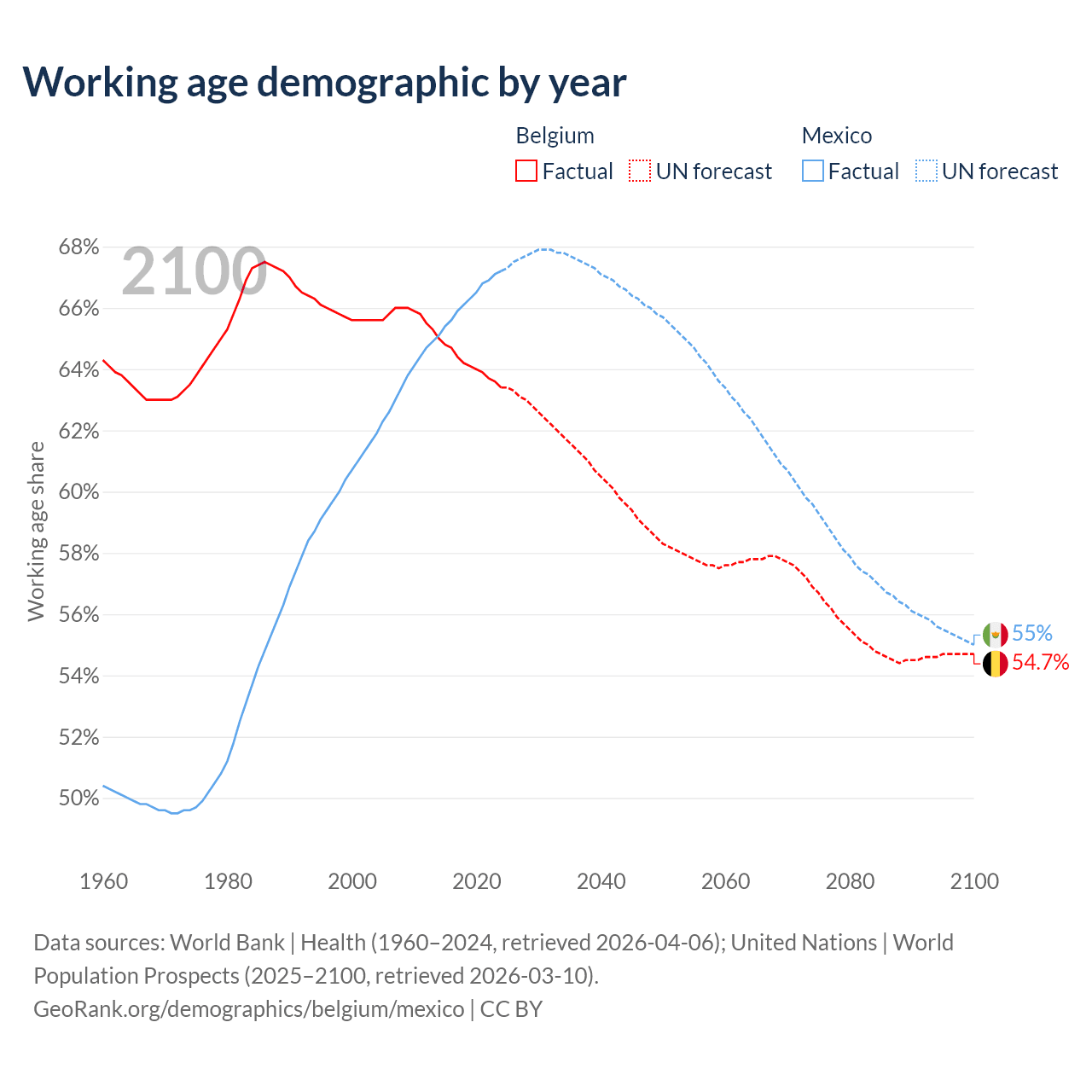 - Belgium has 7.55M working age adults (aged 15-64) vs 89.6M in Mexico.