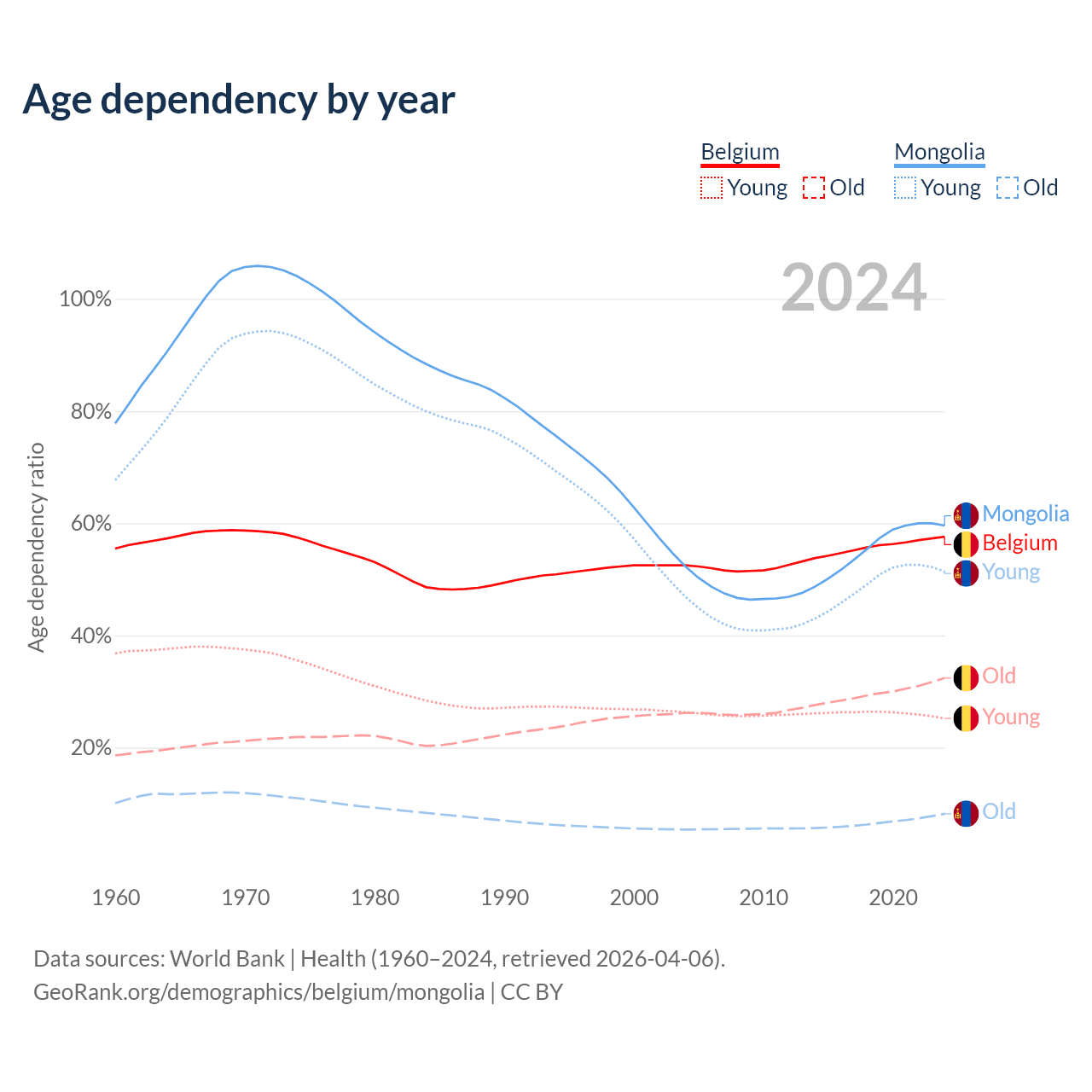 - The share of old-age demographic (65+) in Belgium is 20.6% vs 5.14% in Mongolia.