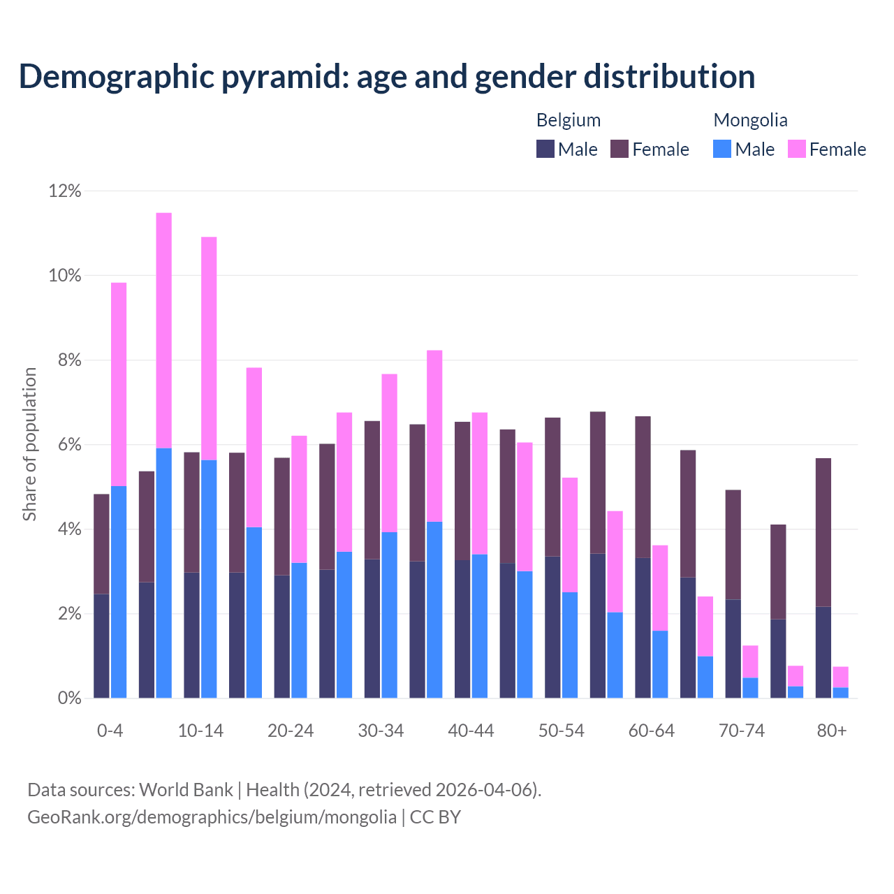- Belgium is ranked 32/196 by median age (oldest to youngest) vs 117/196 for Mongolia.