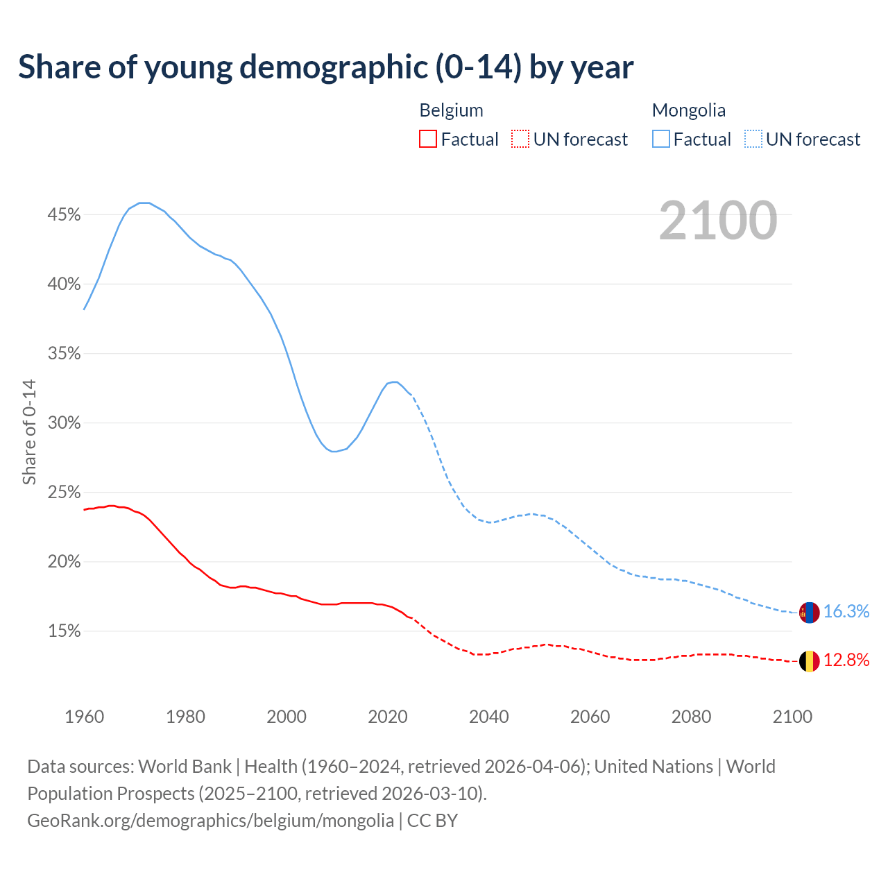 - The share of young demographic (0-15 years old) in Belgium is 16% vs 32.2% in Mongolia.
