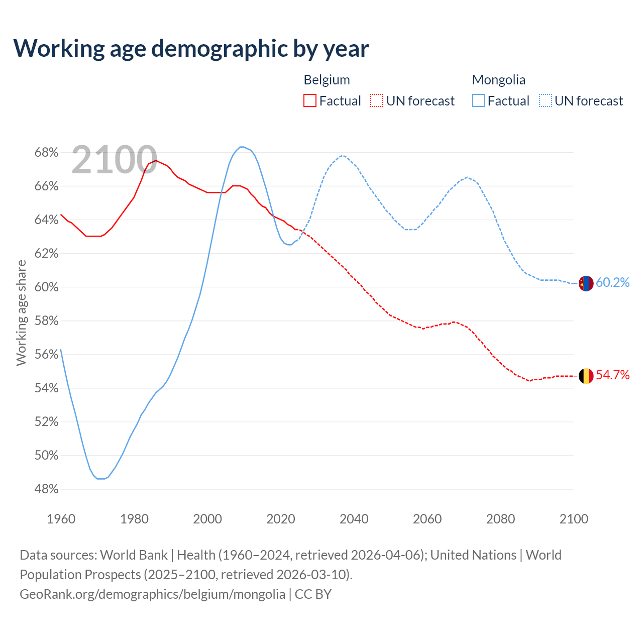 - Belgium has 7.55M working age adults (aged 15-64) vs 2.27M in Mongolia.