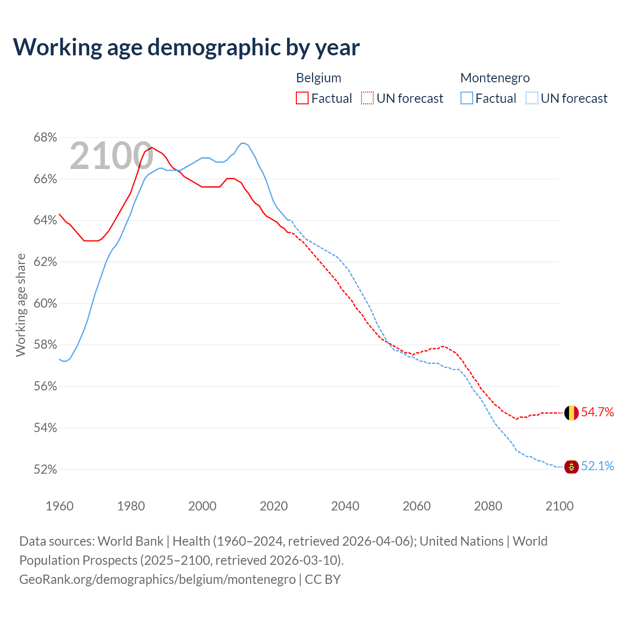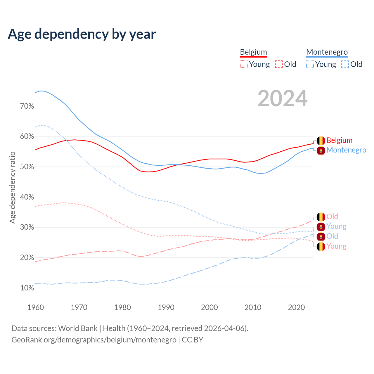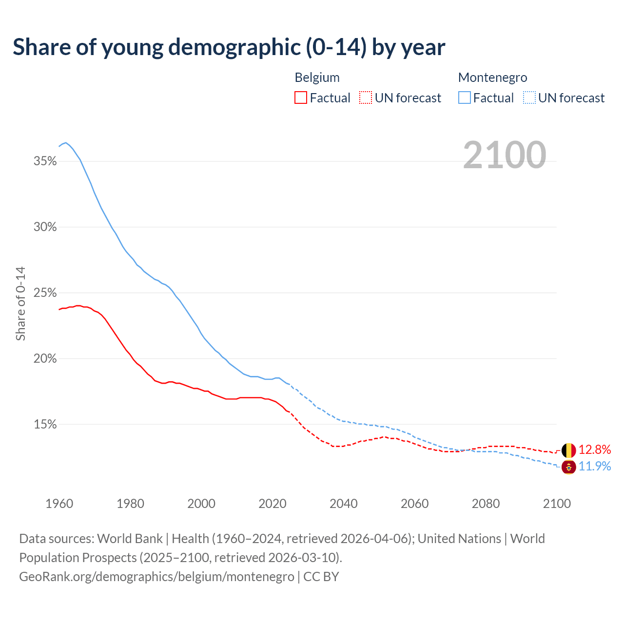 - The share of young demographic (0-15 years old) in Belgium is 16% vs 18.1% in Montenegro.