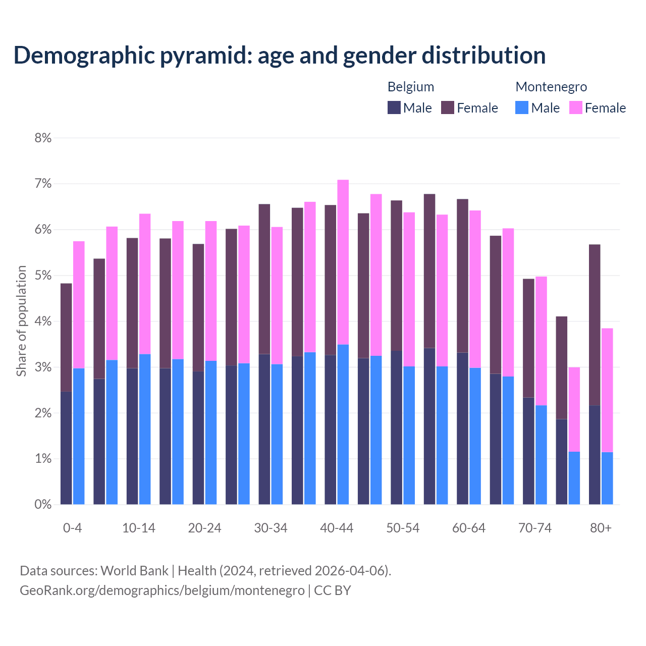 - As of 2026, the population of Belgium is 11.9M vs 612K in Montenegro - 19.4 times difference.