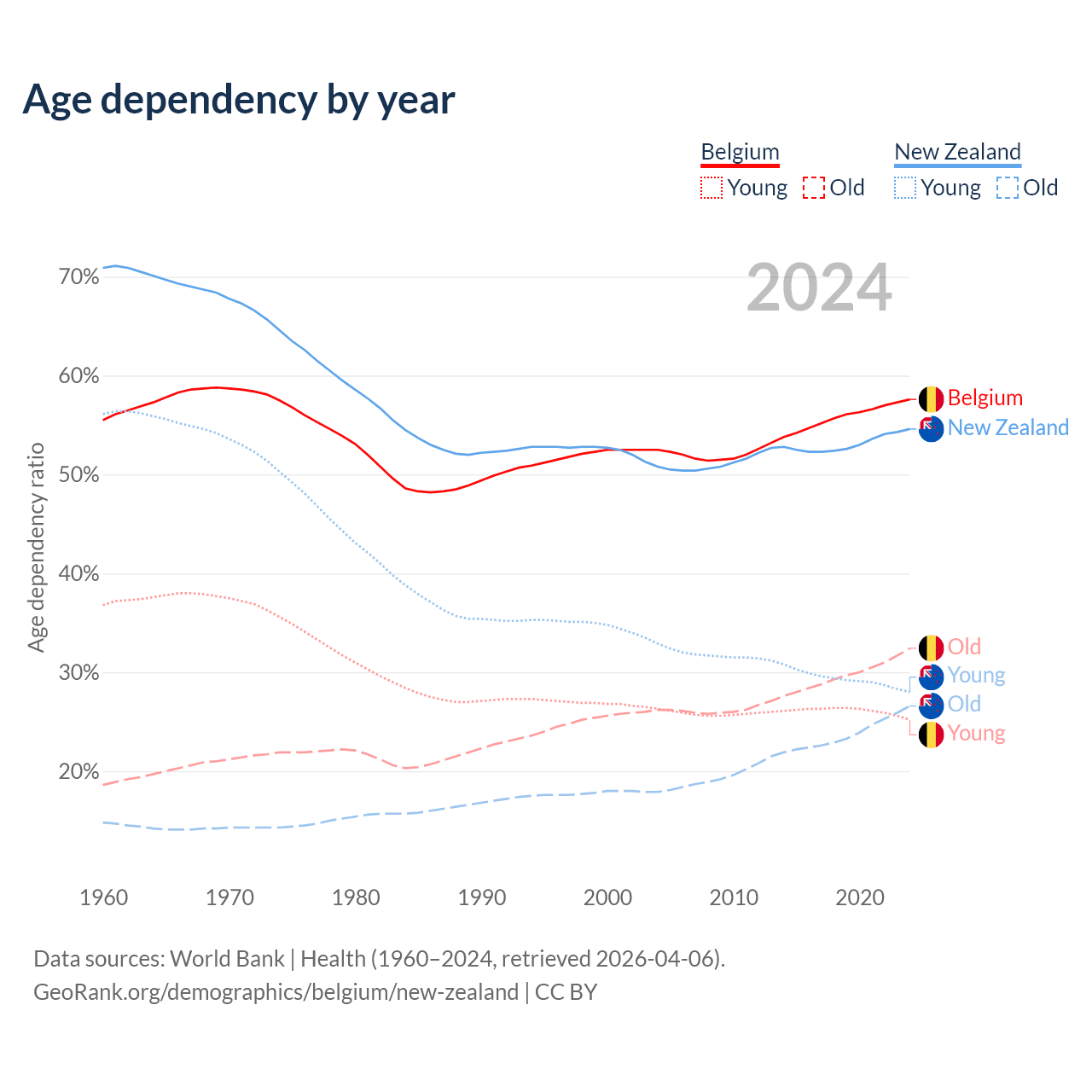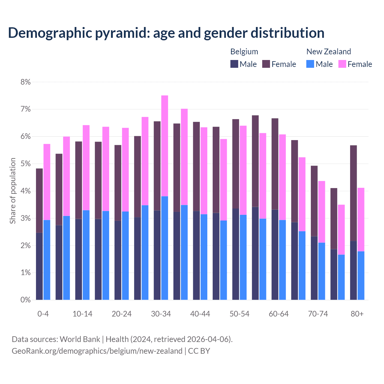 - Belgium is ranked 32/196 by median age (oldest to youngest) vs 56/196 for New Zealand.