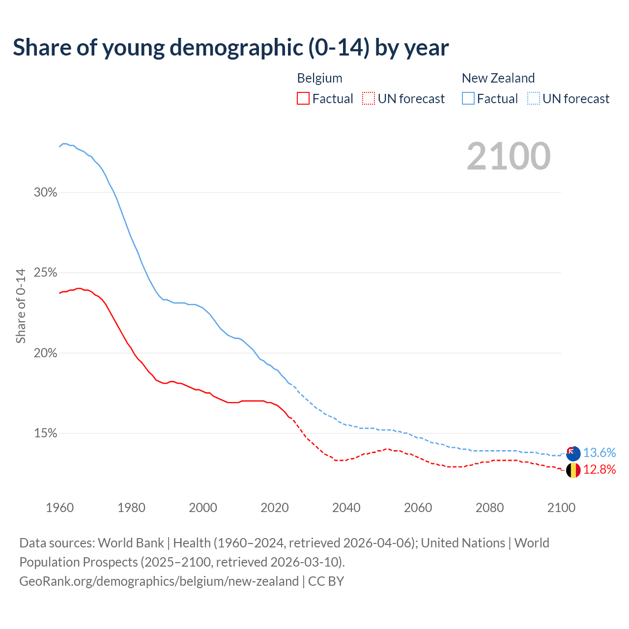 - The share of young demographic (0-15 years old) in Belgium is 16% vs 18.1% in New Zealand.
