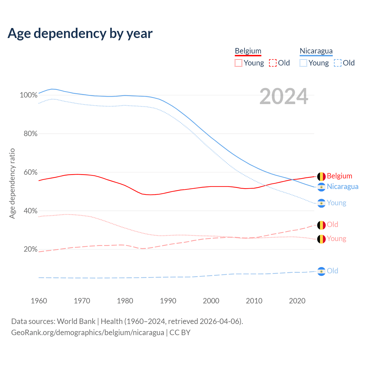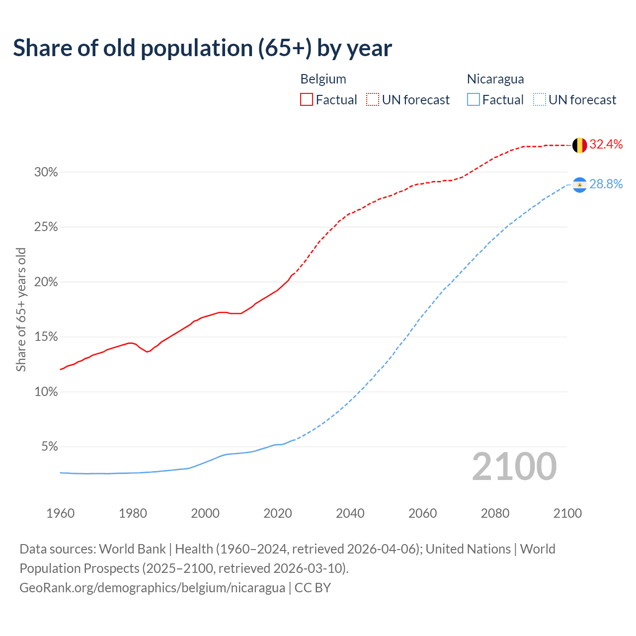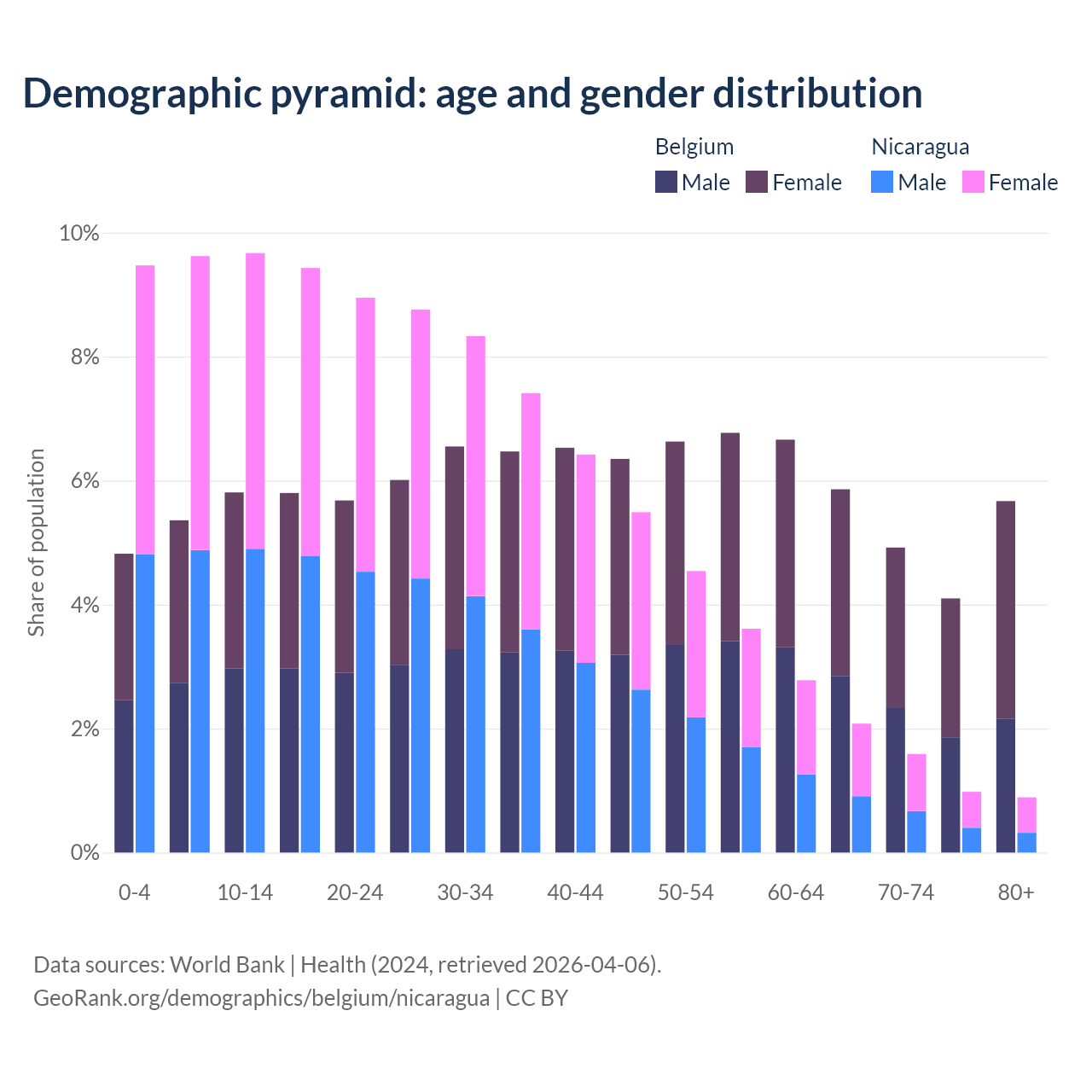 - The share of old-age demographic (65+) in Belgium is 20.6% vs 5.53% in Nicaragua.