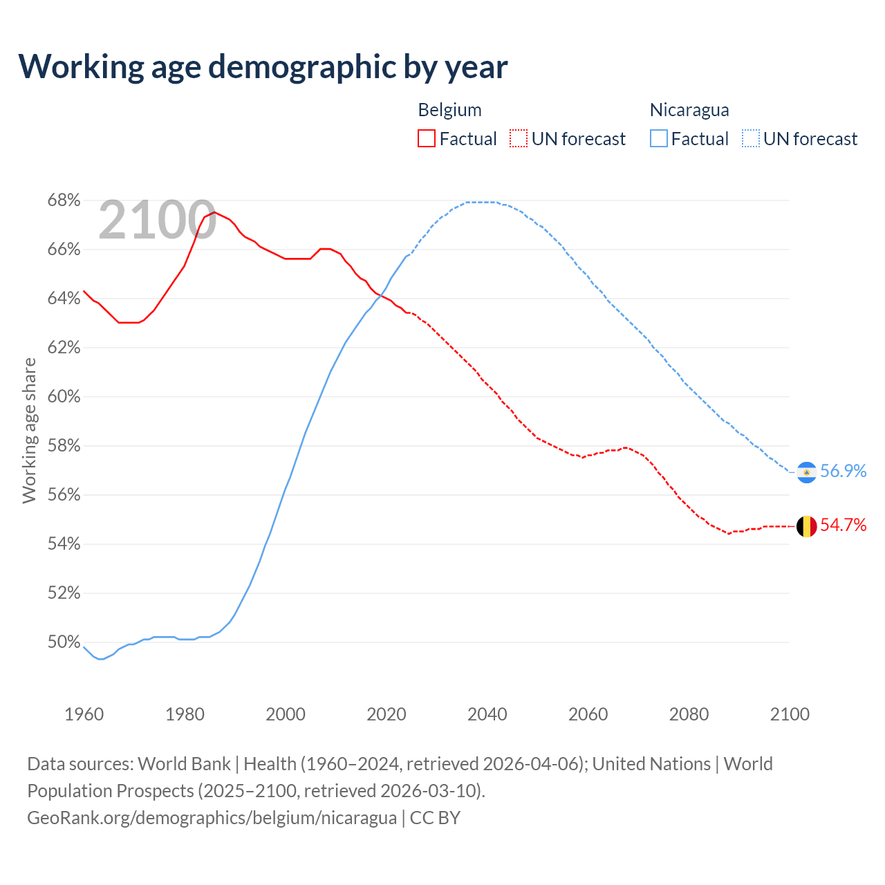 - Belgium has 7.55M working age adults (aged 15-64) vs 4.68M in Nicaragua.