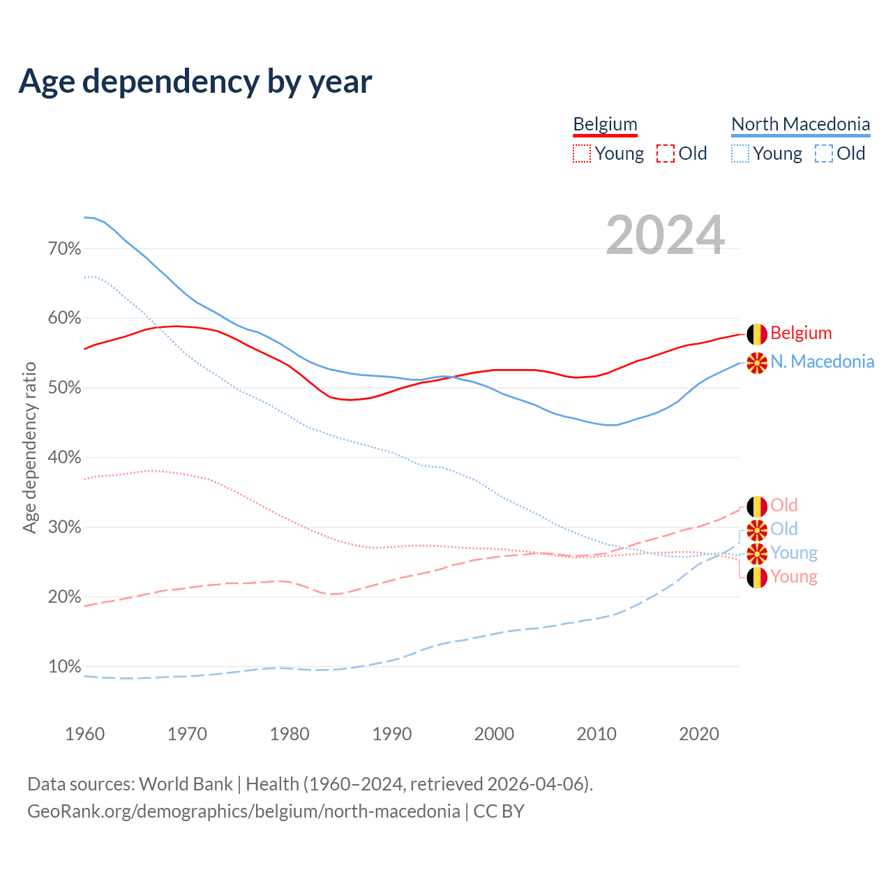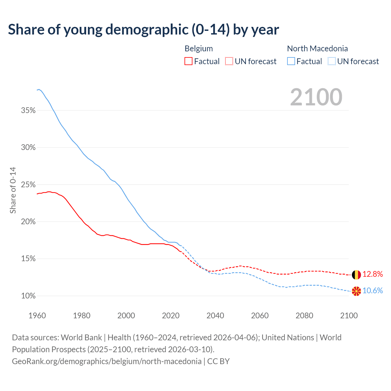 - The share of young demographic (0-15 years old) in Belgium is 16% vs 16.8% in North Macedonia.