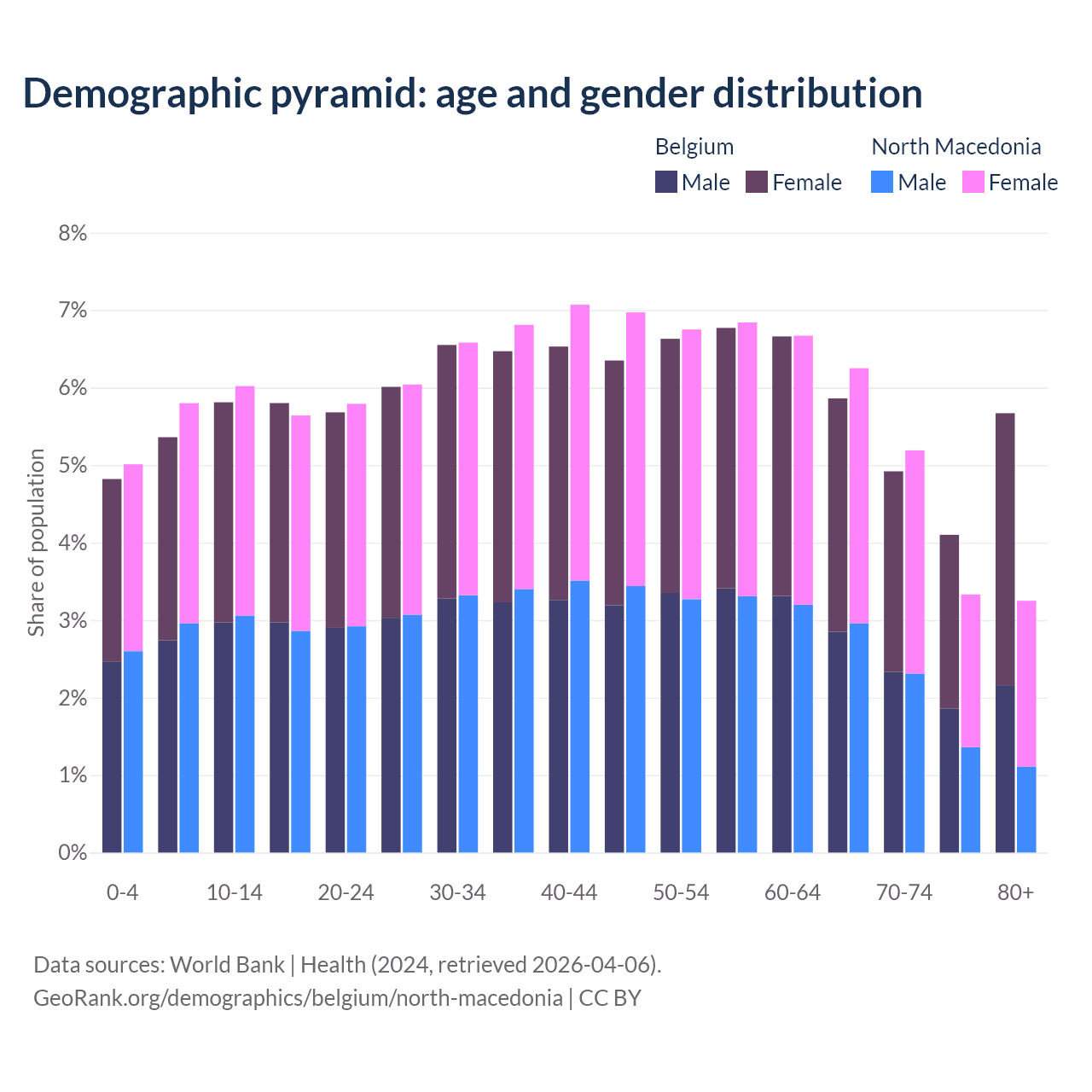 - The share of old-age demographic (65+) in Belgium is 20.6% vs 18% in North Macedonia.