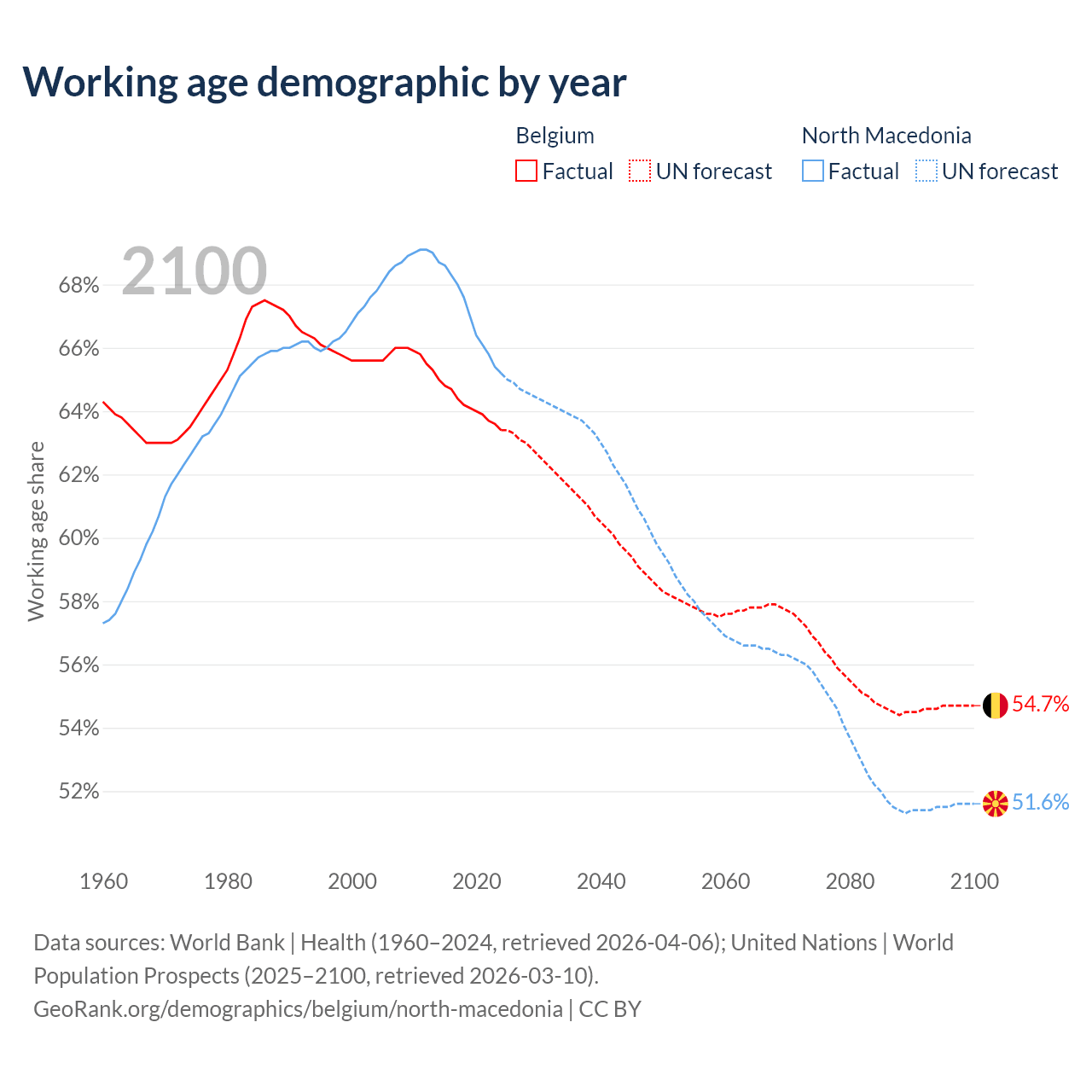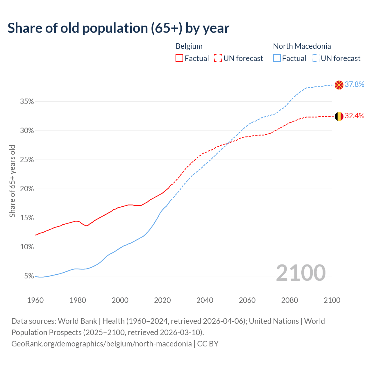 Median age Belgium vs North Macedonia, 1960-2100