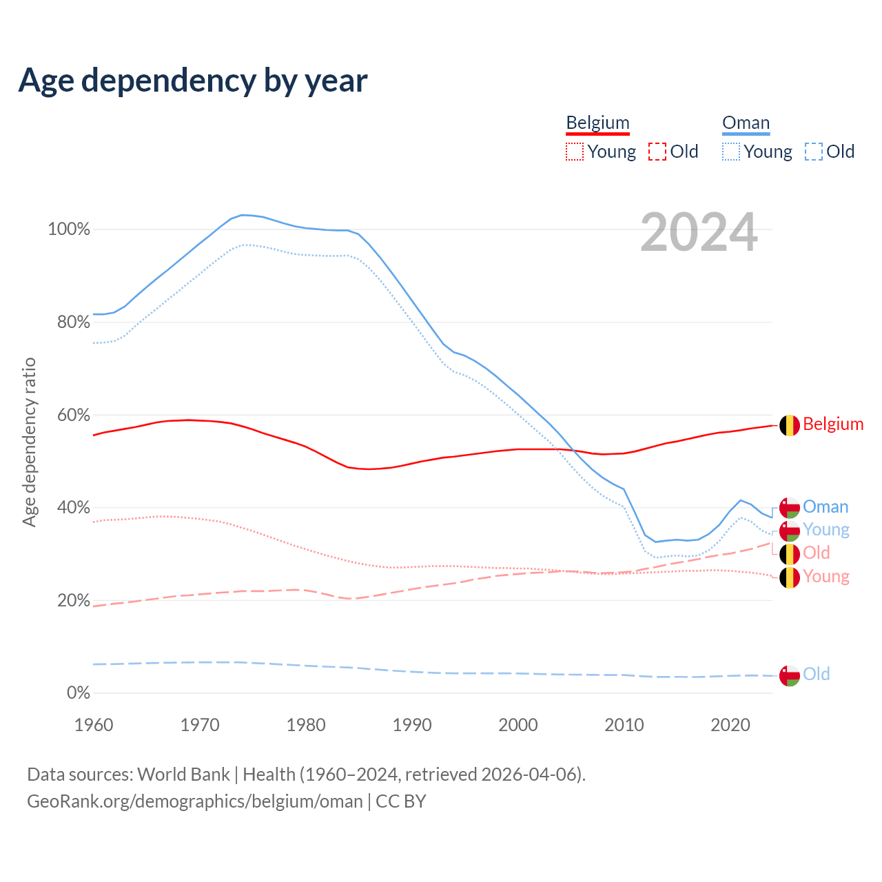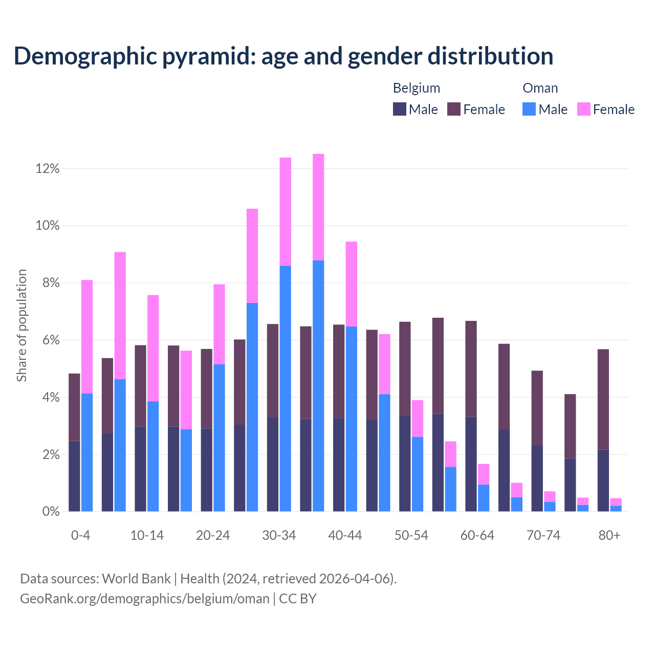 - Belgium is ranked 32/196 by median age (oldest to youngest) vs 101/196 for Oman.