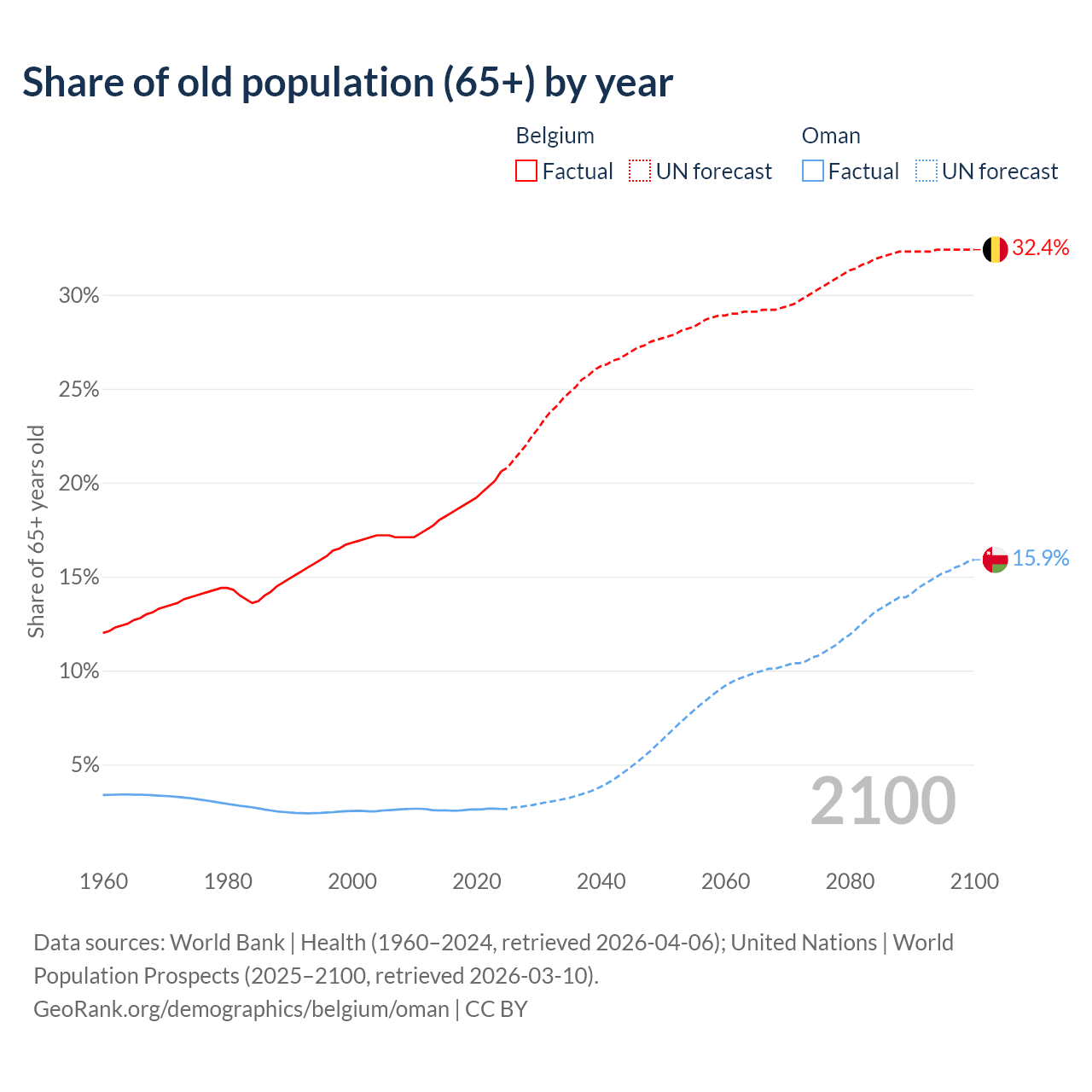 The share of older people aged 65 and over is 20.6% in Belgium and 2.64% in Oman. Life expectancy in Belgium compared to Oman .