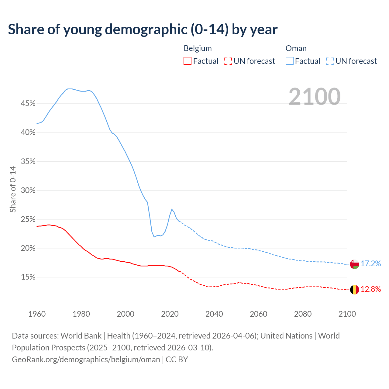 - The share of young demographic (0-15 years old) in Belgium is 16% vs 24.7% in Oman.