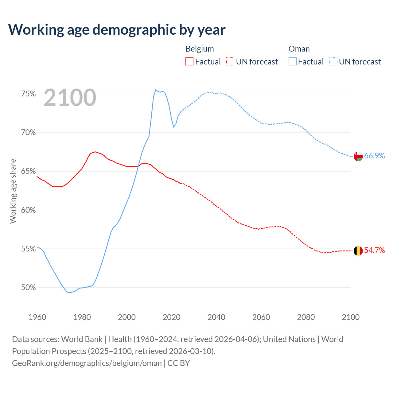 - Belgium has 7.55M working age adults (aged 15-64) vs 4.19M in Oman.