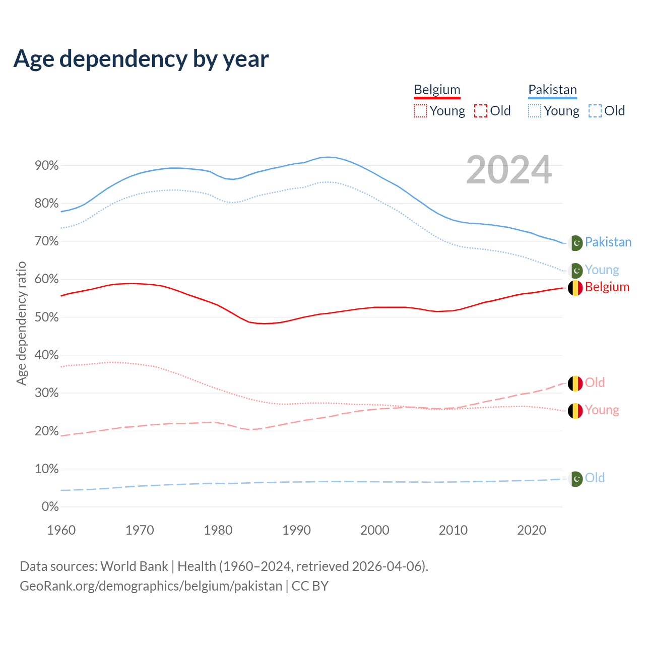 - Belgium is ranked 32/196 by median age (oldest to youngest) vs 154/196 for Pakistan.