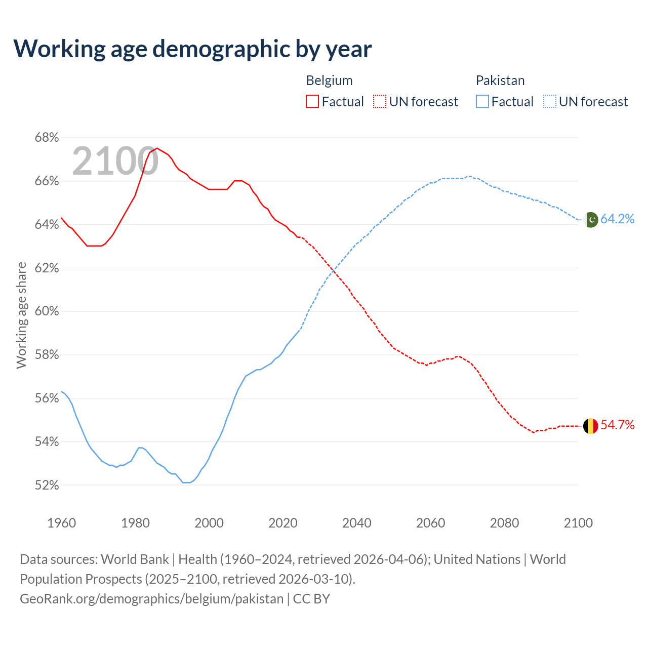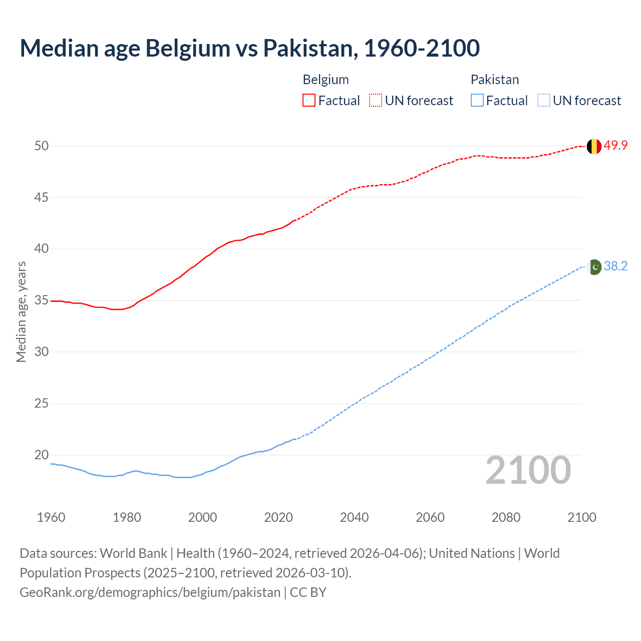 Median age Belgium vs Pakistan, 1960-2100