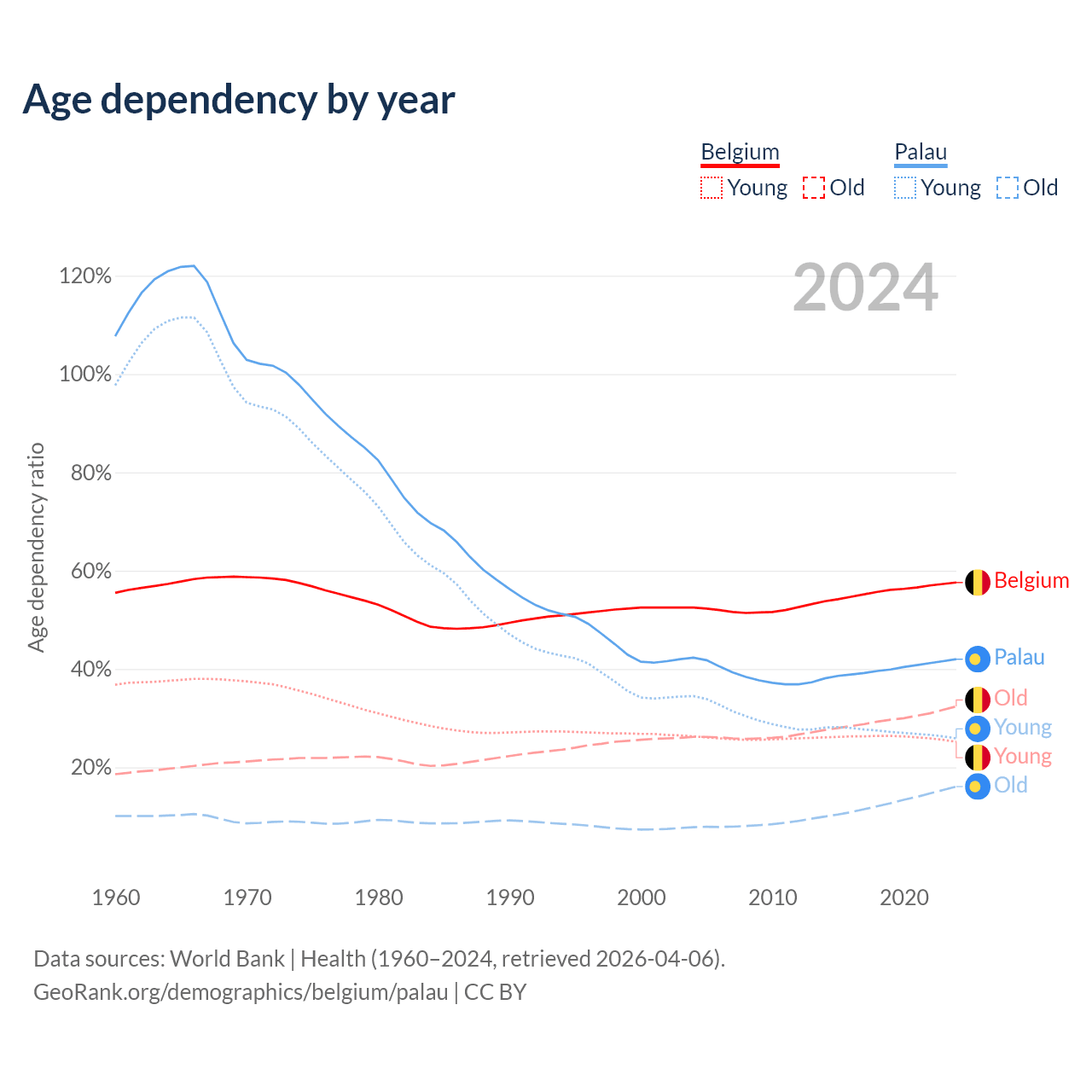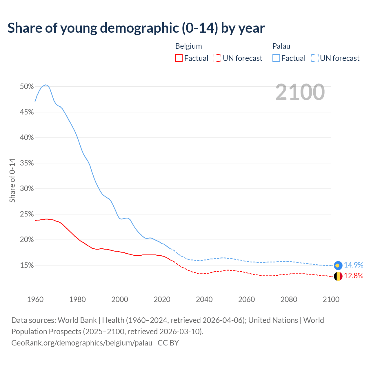 - The share of young demographic (0-15 years old) in Belgium is 16% vs 18.2% in Palau.