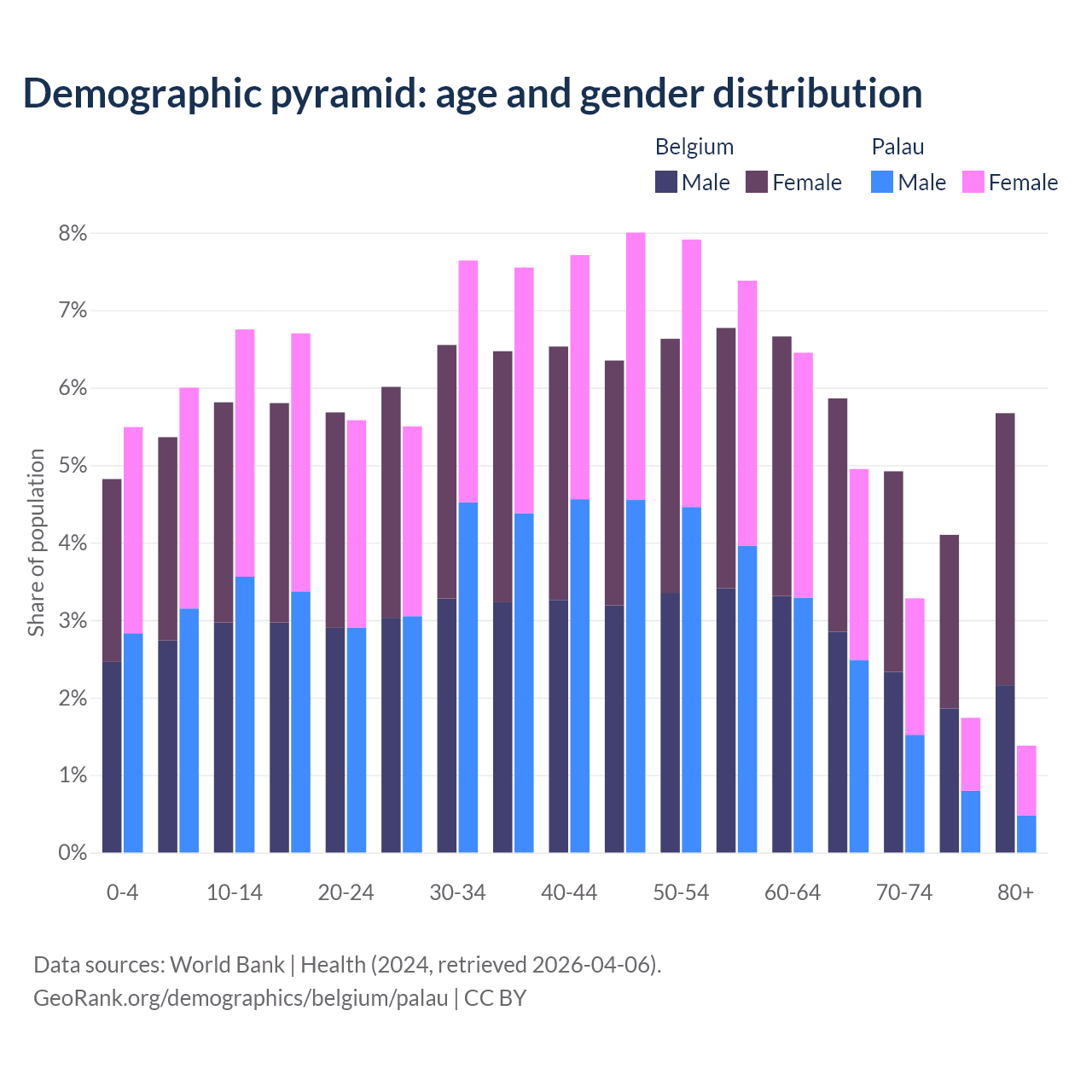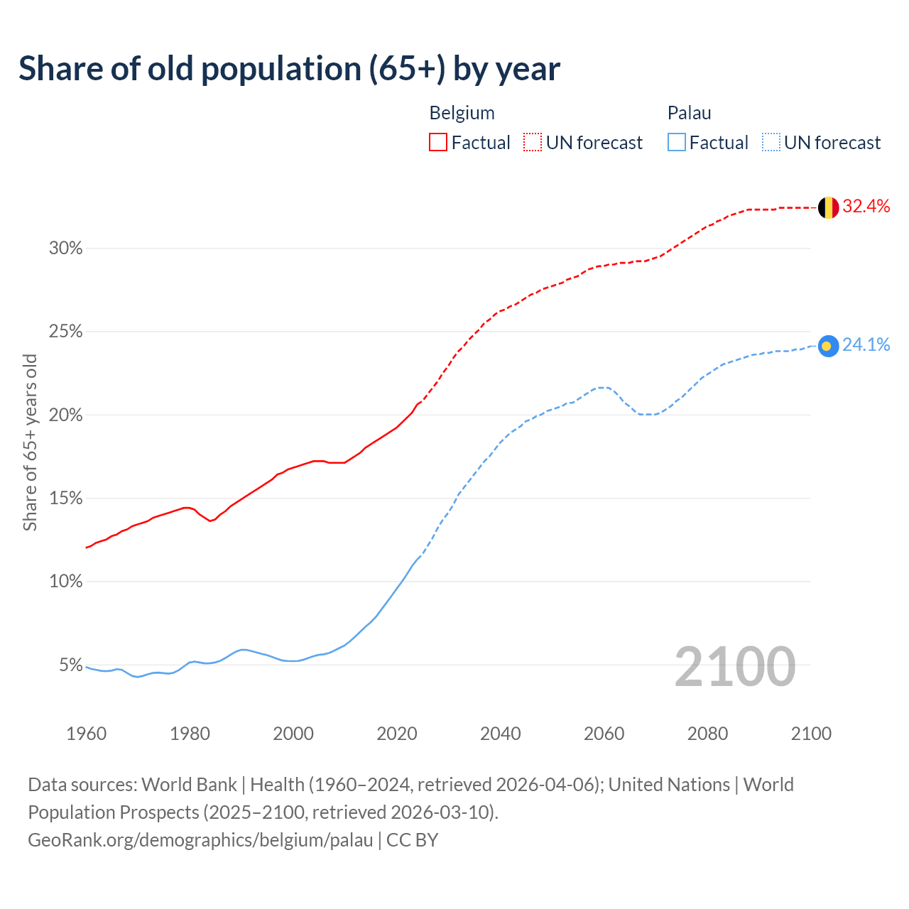 - The share of old-age demographic (65+) in Belgium is 20.6% vs 11.3% in Palau.