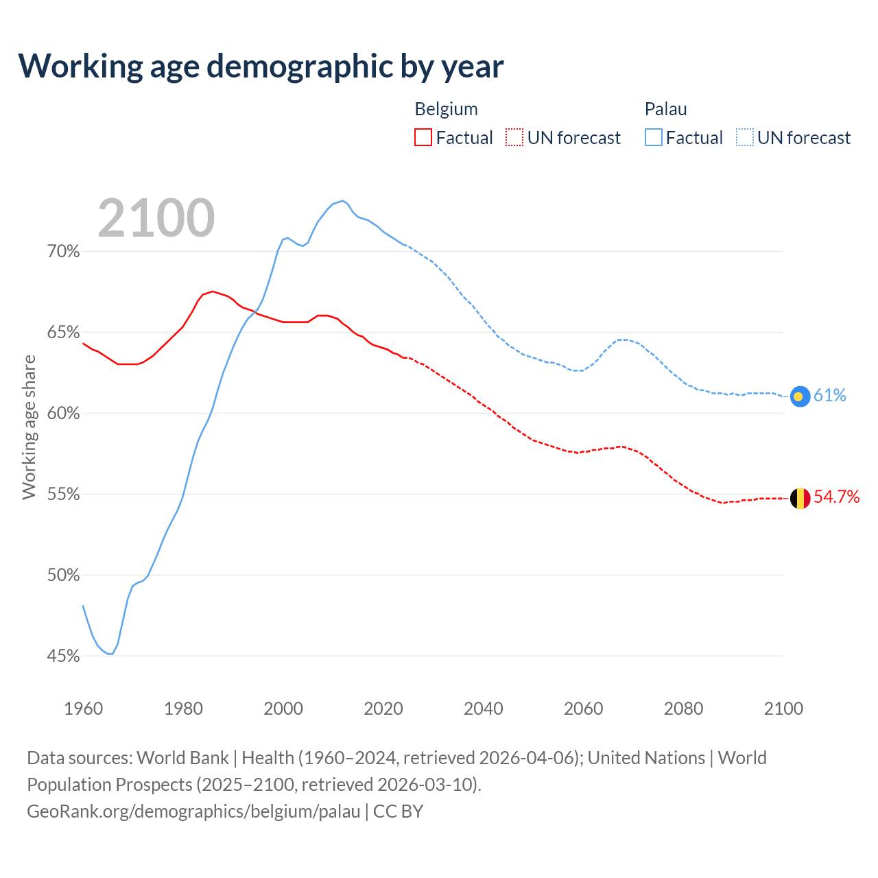 Median age Belgium vs Palau, 1960-2100