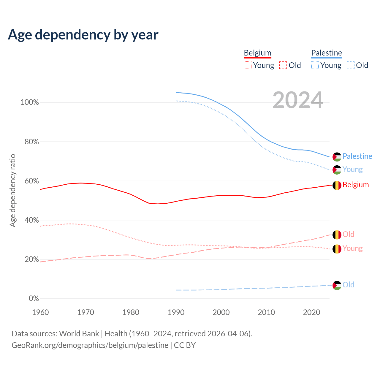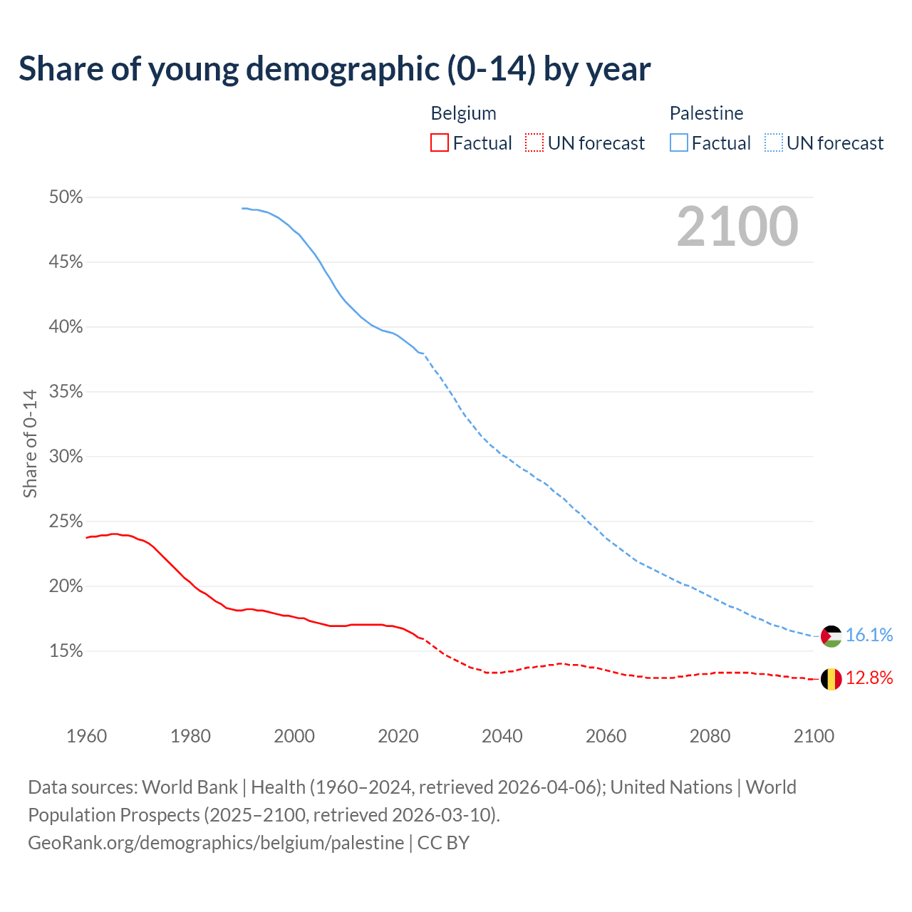 - The share of young demographic (0-15 years old) in Belgium is 16% vs 38% in Palestine.