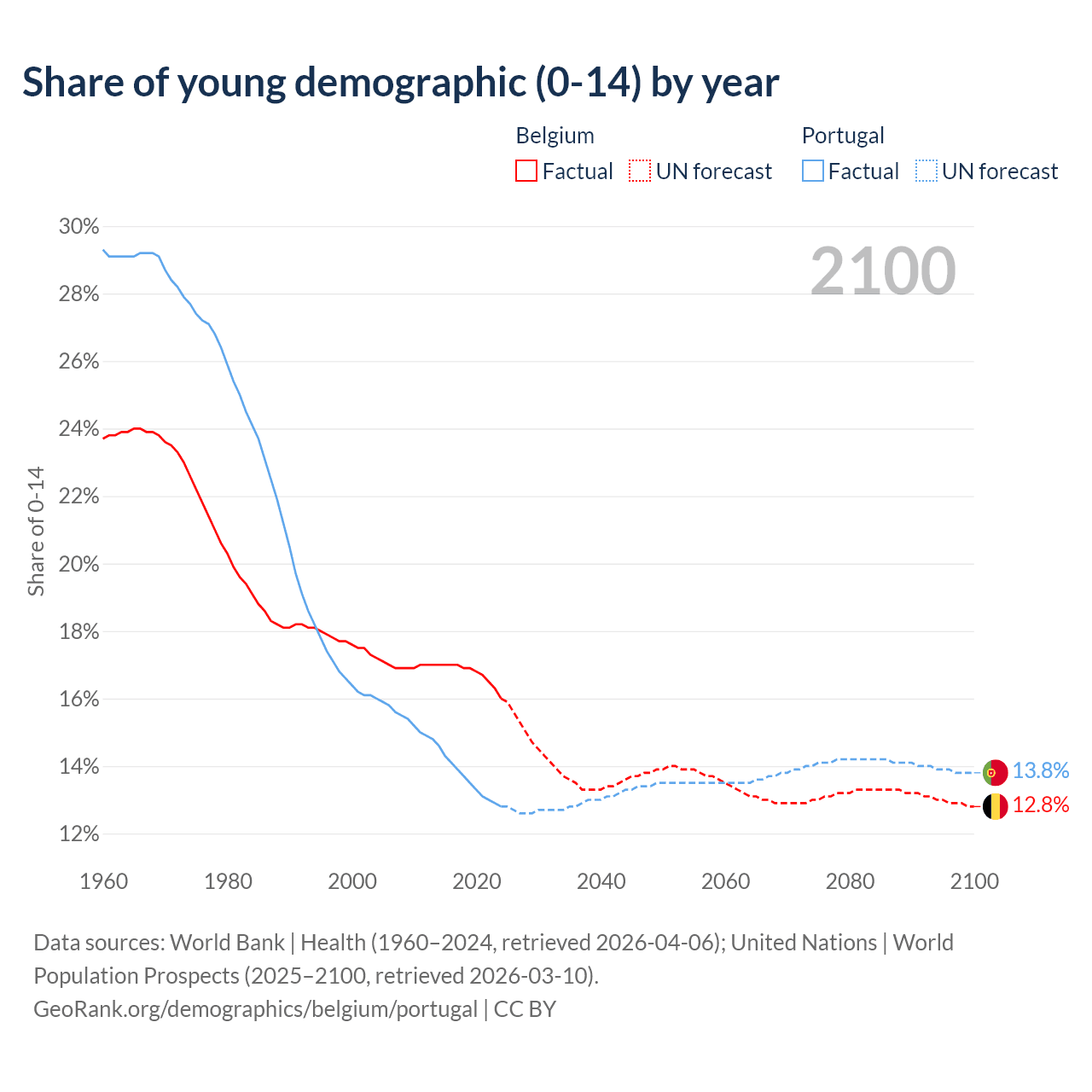 - The share of young demographic (0-15 years old) in Belgium is 16% vs 12.8% in Portugal.