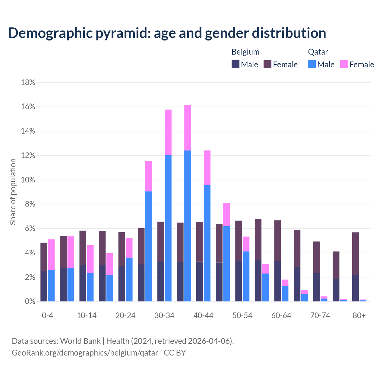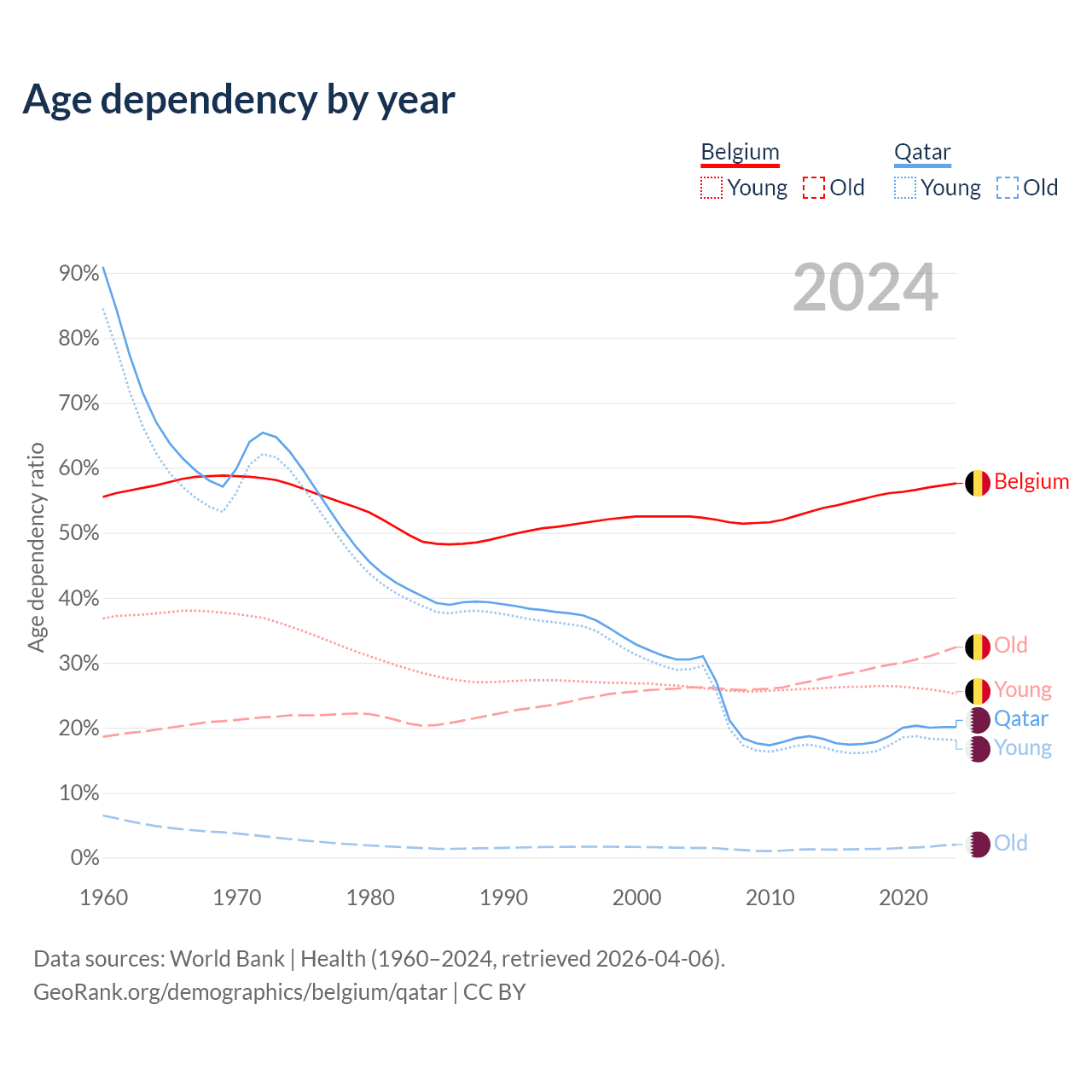- Belgium is ranked 32/196 by median age (oldest to youngest) vs 78/196 for Qatar.