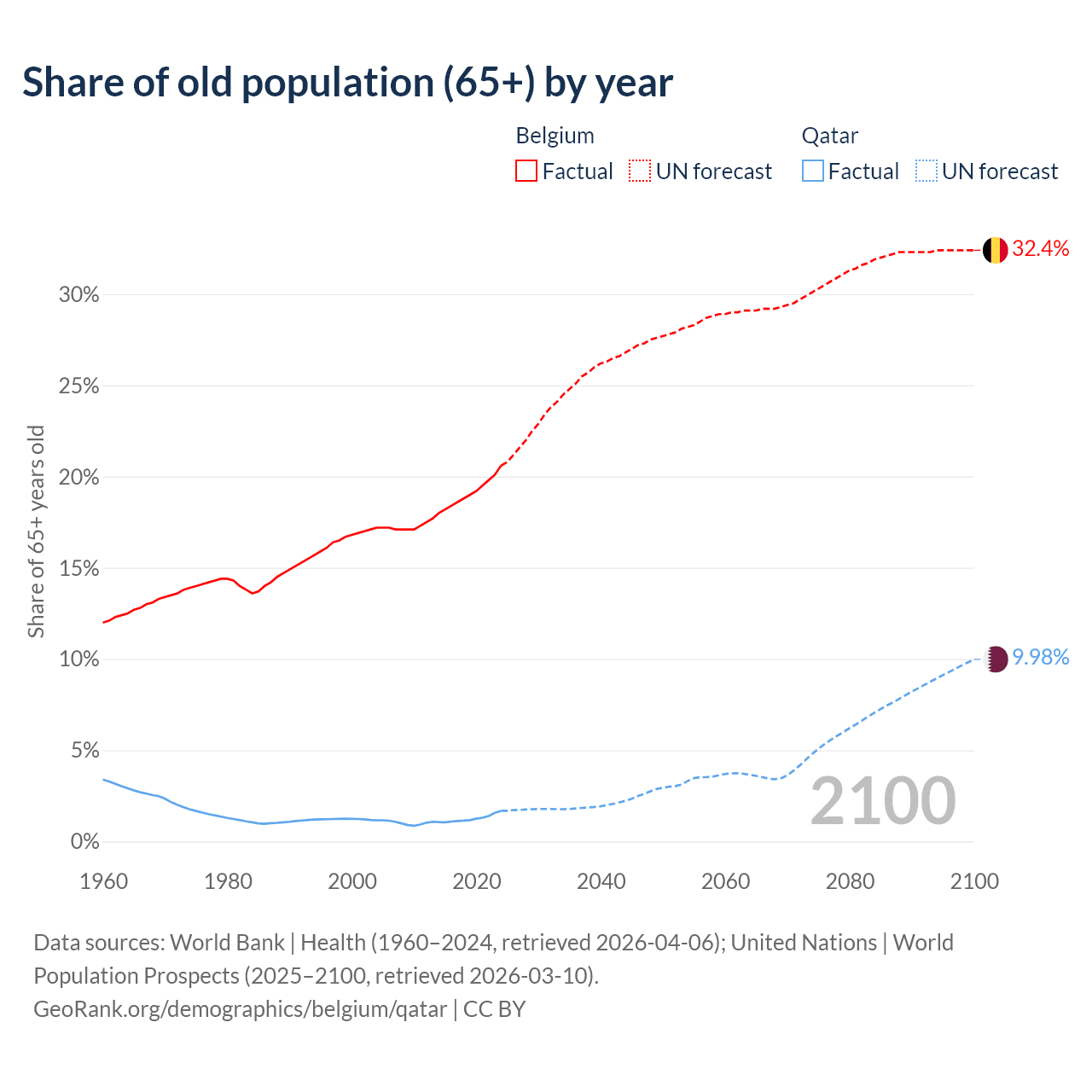 The share of older people aged 65 and over is 20.6% in Belgium and 1.68% in Qatar. Life expectancy in Belgium compared to Qatar .