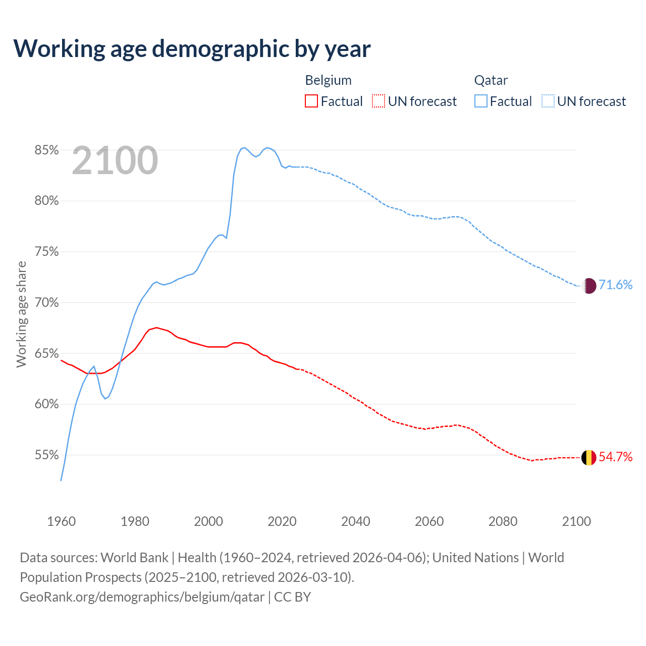 Median age Belgium vs Qatar, 1960-2100