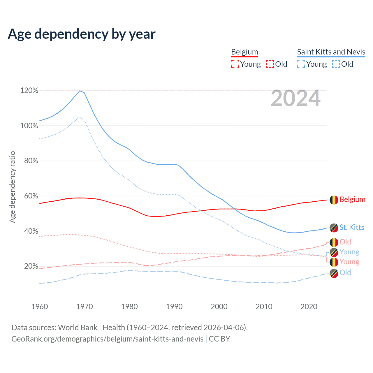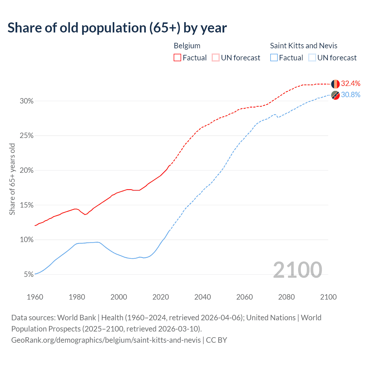 The share of older people aged 65 and over is 20.6% in Belgium and 11.2% in Saint Kitts and Nevis. Life expectancy in Belgium compared to Saint Kitts and Nevis .