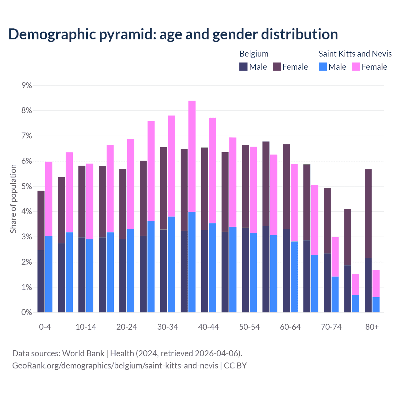 - The share of old-age demographic (65+) in Belgium is 20.6% vs 11.2% in Saint Kitts and Nevis.