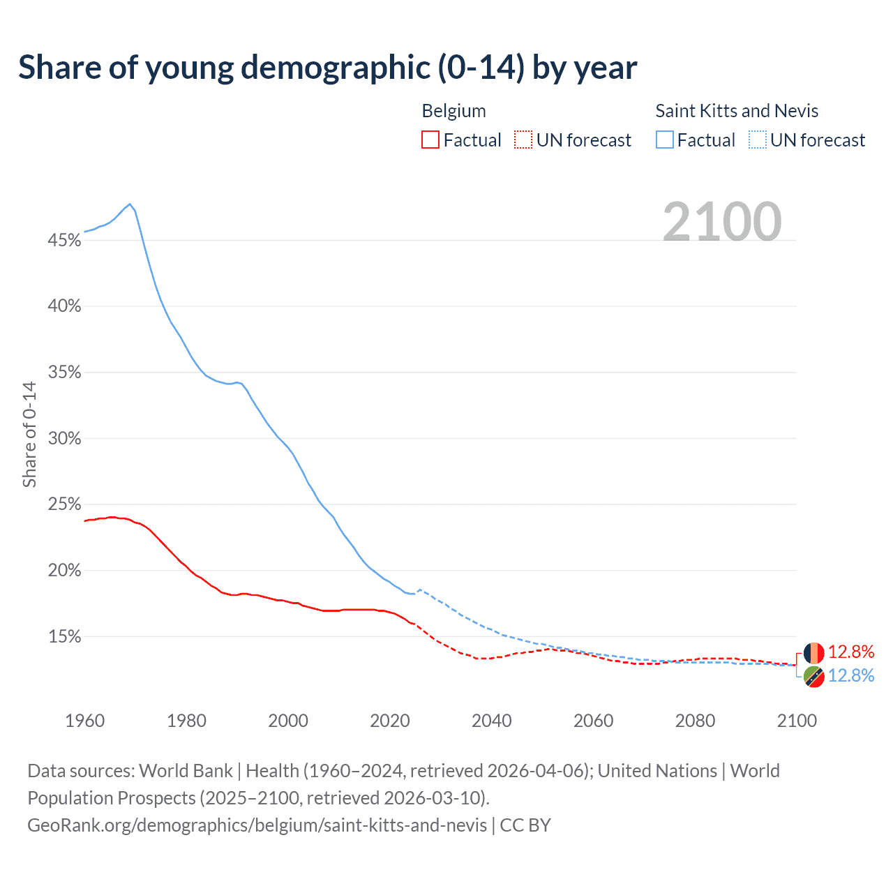 - The share of young demographic (0-15 years old) in Belgium is 16% vs 18.2% in Saint Kitts and Nevis.