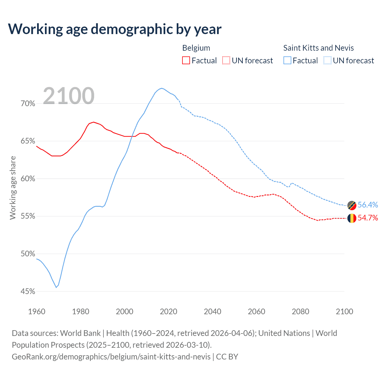 - Belgium has 7.55M working age adults (aged 15-64) vs 33.2K in Saint Kitts and Nevis.