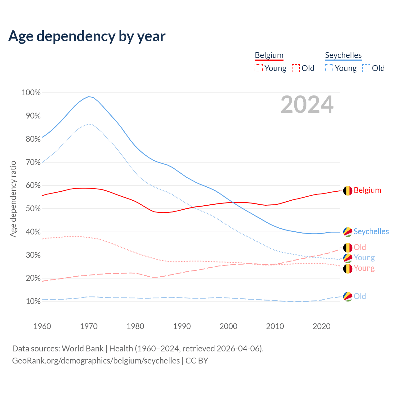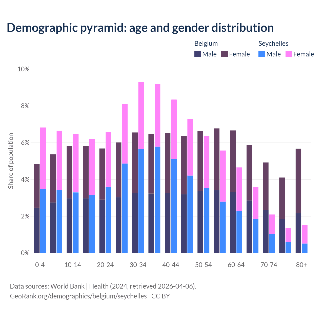 - Belgium is ranked 32/196 by median age (oldest to youngest) vs 76/196 for the Seychelles.
