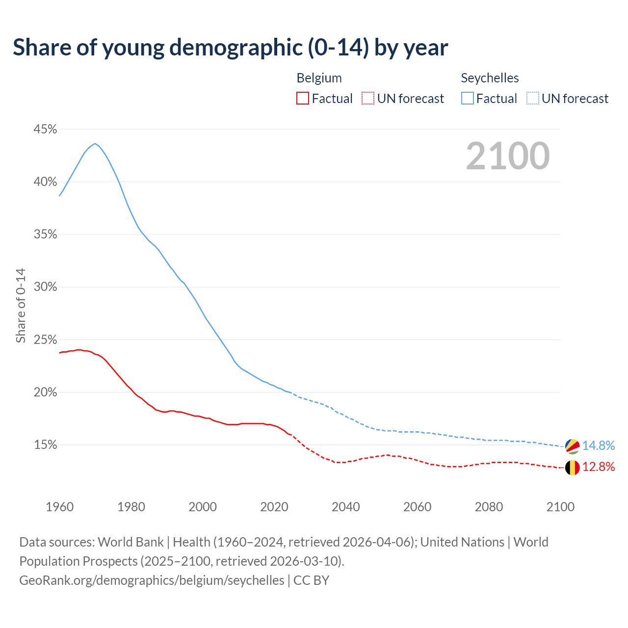 - The share of young demographic (0-15 years old) in Belgium is 16% vs 20% in the Seychelles.