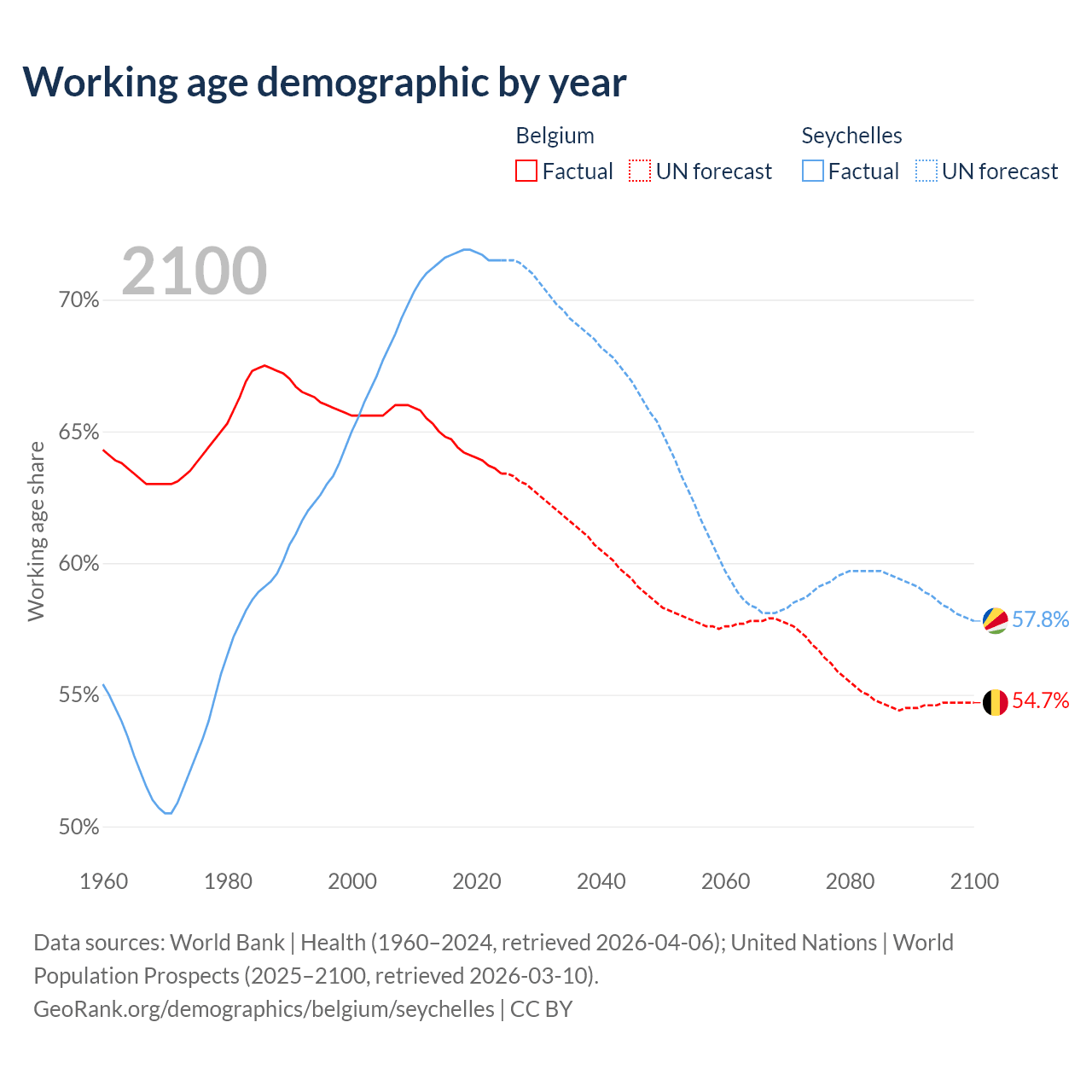 - Belgium has 7.55M working age adults (aged 15-64) vs 90.3K in the Seychelles.