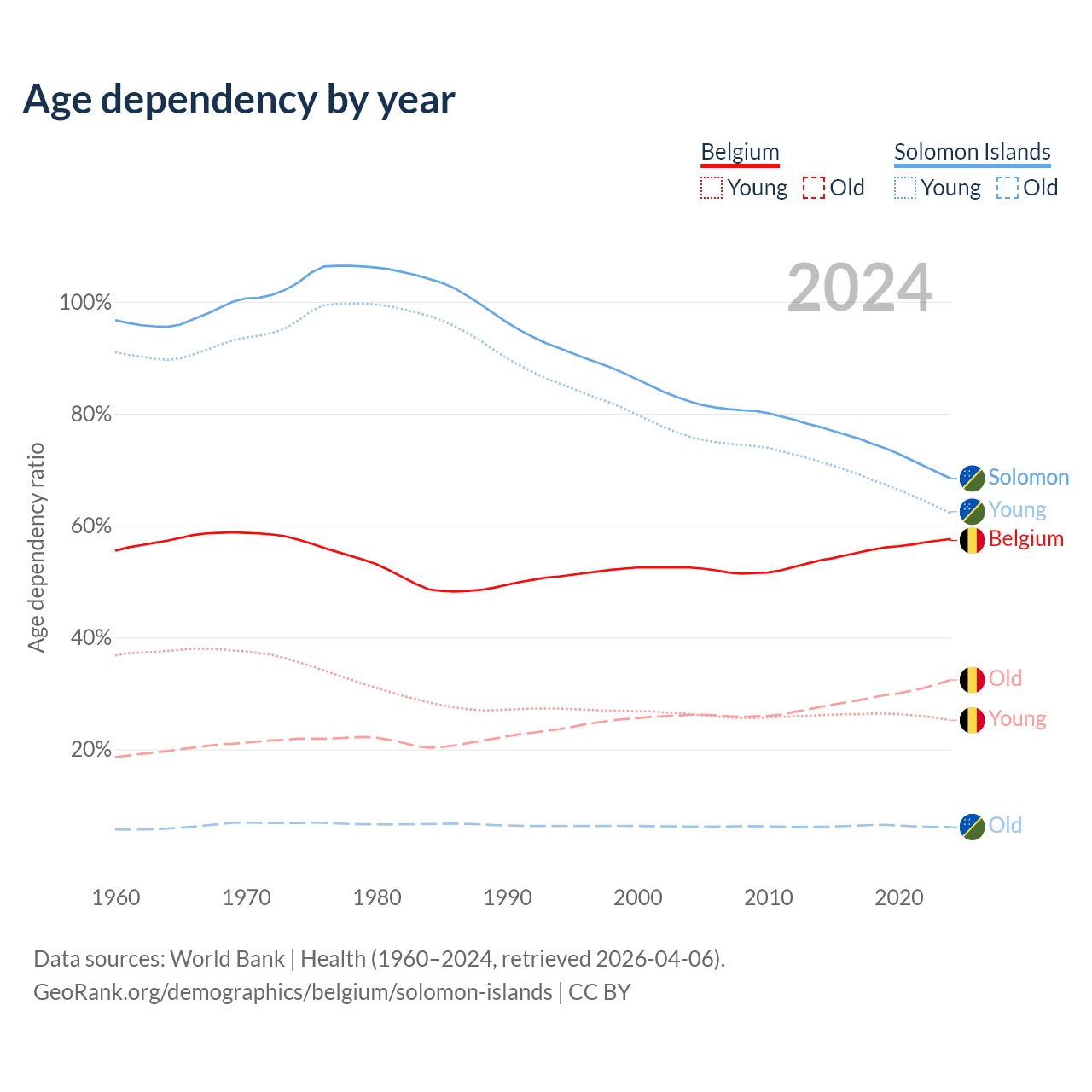 - Belgium is ranked 32/196 by median age (oldest to youngest) vs 153/196 for the Solomon Islands.