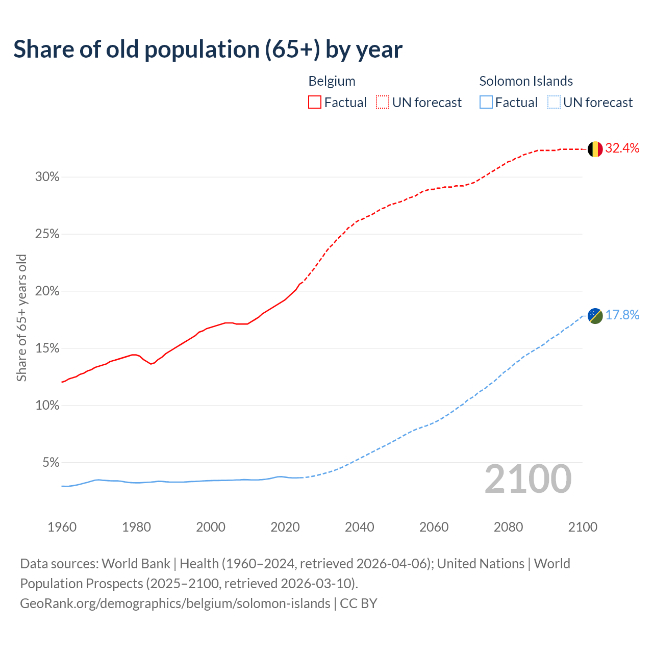 The share of older people aged 65 and over is 20.6% in Belgium and 3.64% in the Solomon Islands. Life expectancy in Belgium compared to the Solomon Islands .