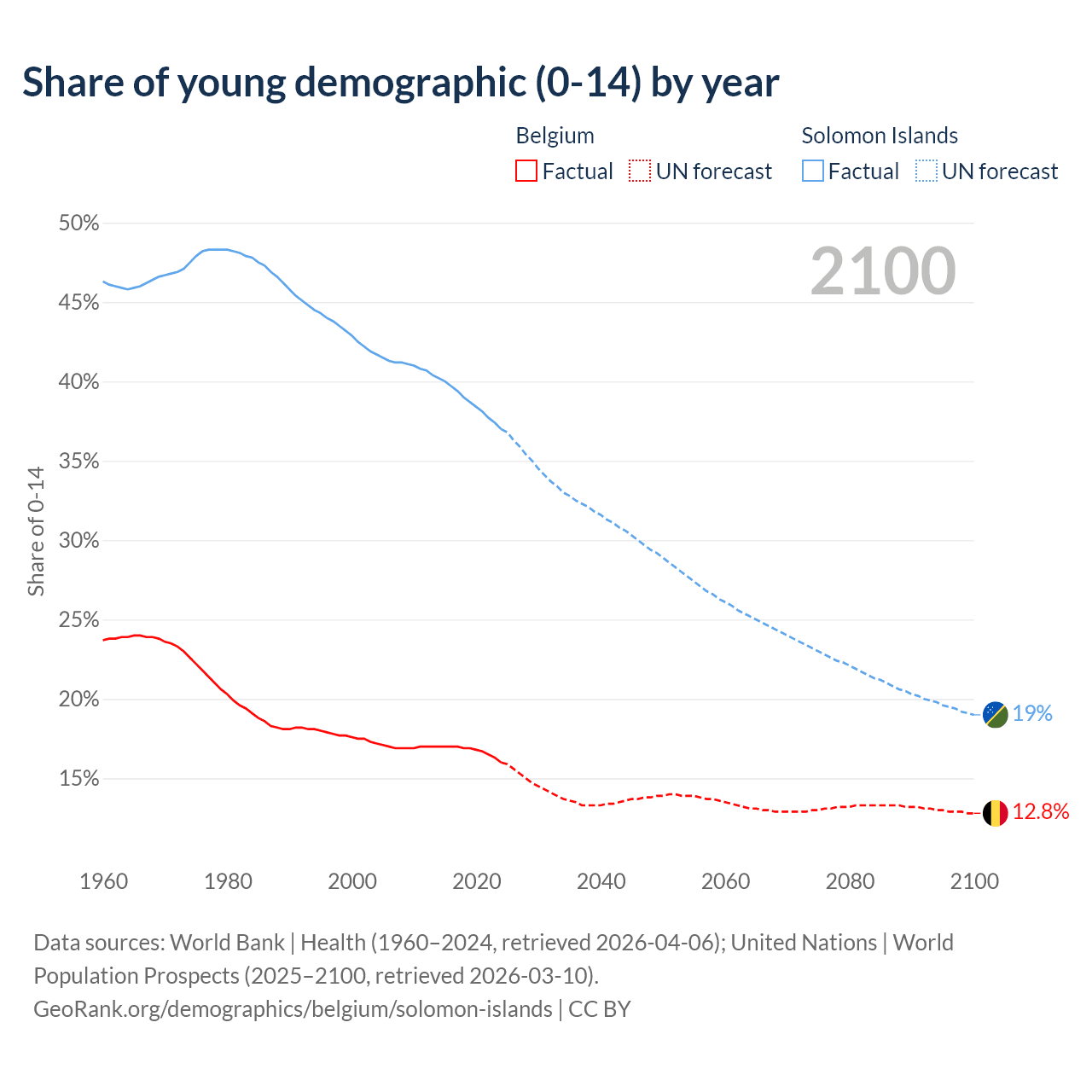 - The share of young demographic (0-15 years old) in Belgium is 16% vs 37% in the Solomon Islands.