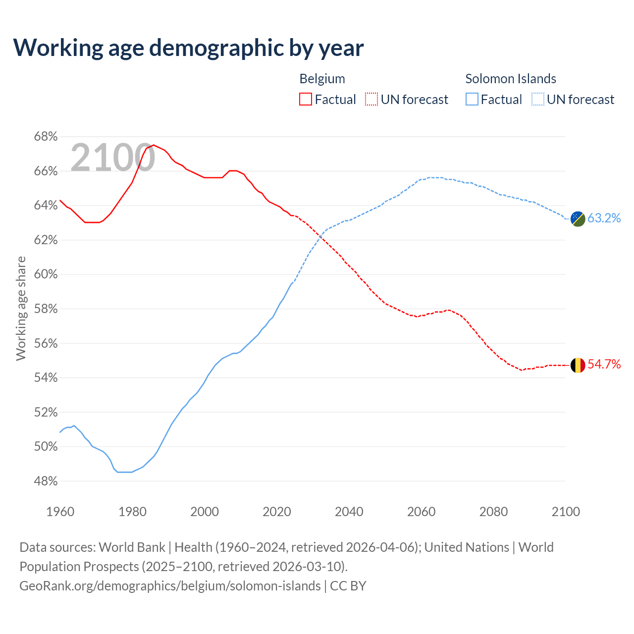 Median age Belgium vs Solomon Islands, 1960-2100
