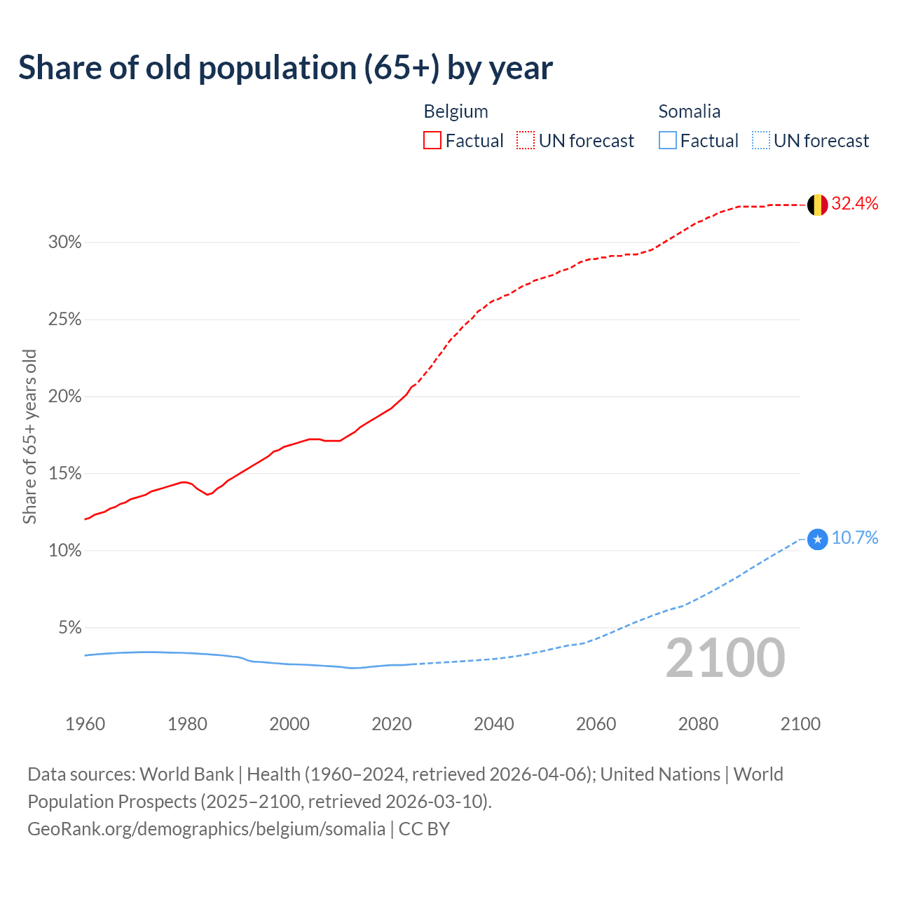 The share of older people aged 65 and over is 20.6% in Belgium and 2.59% in Somalia. Life expectancy in Belgium compared to Somalia .