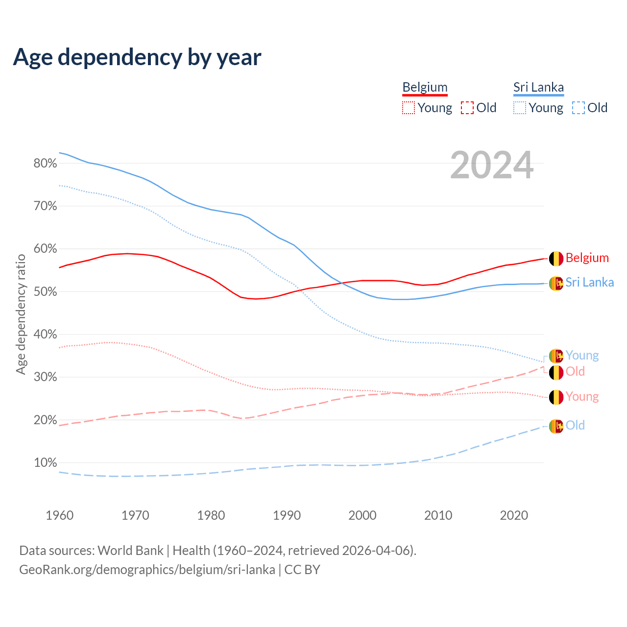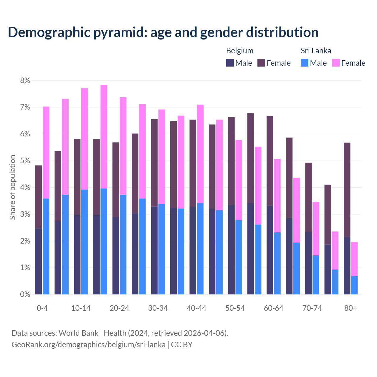 The share of older people aged 65 and over is 20.6% in Belgium and 12.1% in Sri Lanka. Life expectancy in Belgium compared to Sri Lanka .