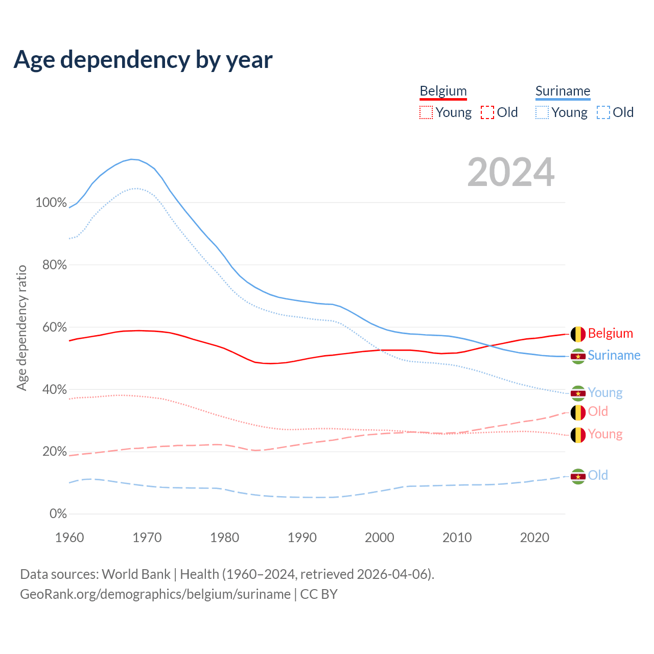 - The share of young demographic (0-15 years old) in Belgium is 16% vs 25.6% in Suriname.