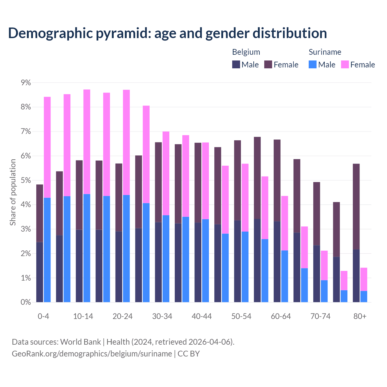 - The share of old-age demographic (65+) in Belgium is 20.6% vs 7.9% in Suriname.
