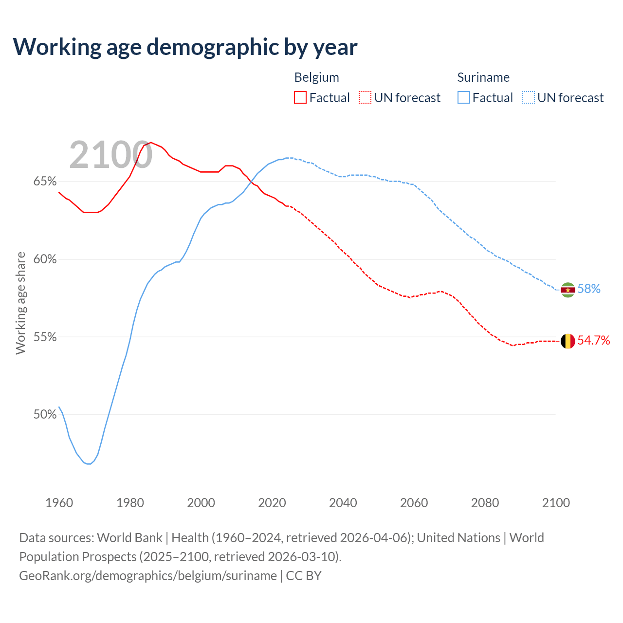 - Belgium has 7.55M working age adults (aged 15-64) vs 430K in Suriname.