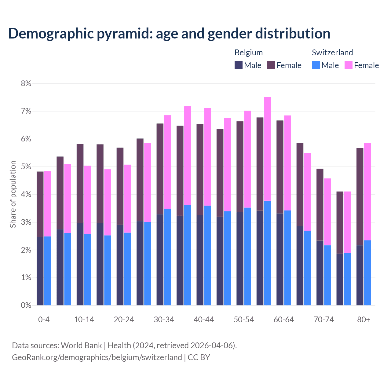 - Belgium is ranked 32/196 by median age (oldest to youngest) vs 24/196 for Switzerland.