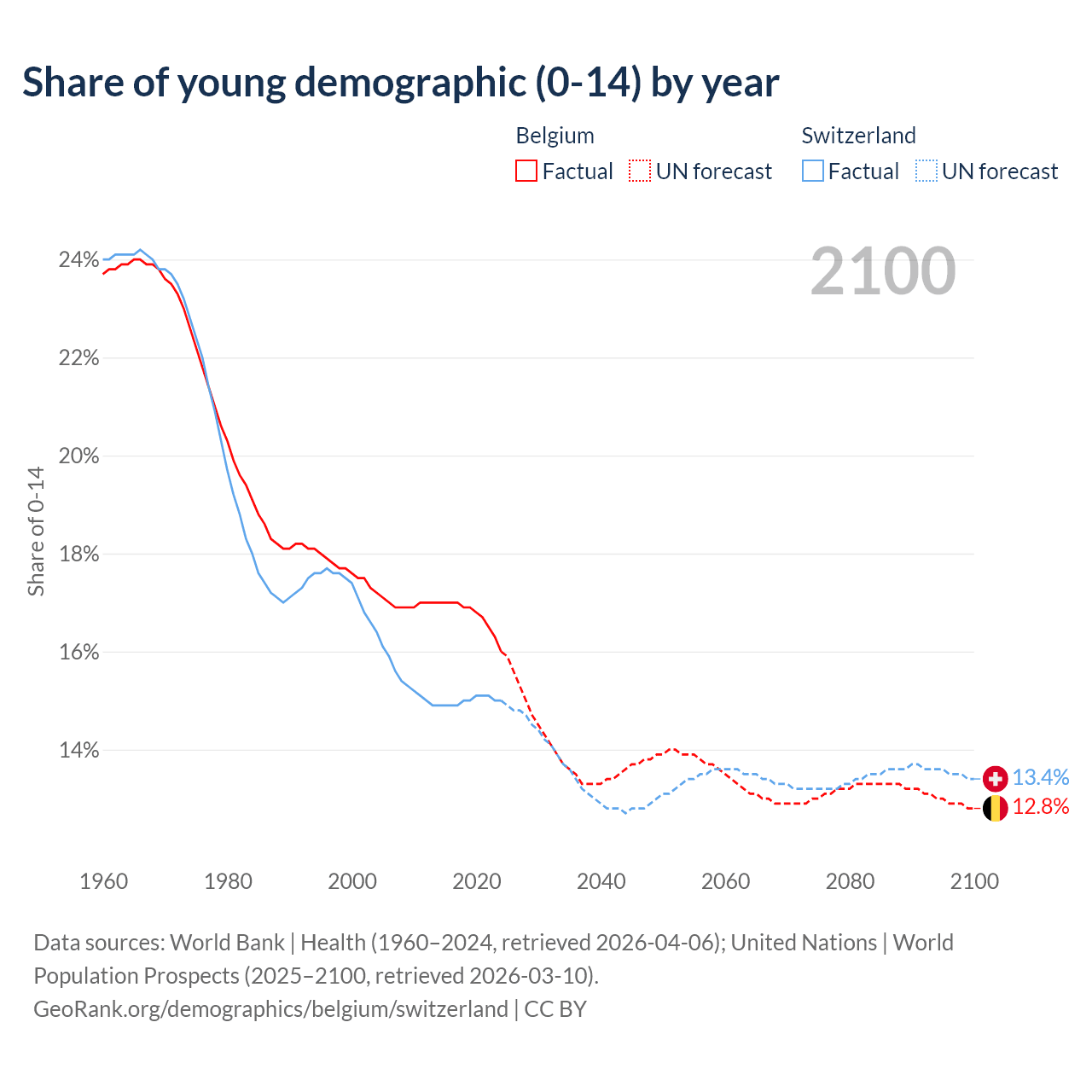 - The share of young demographic (0-15 years old) in Belgium is 16% vs 15% in Switzerland.