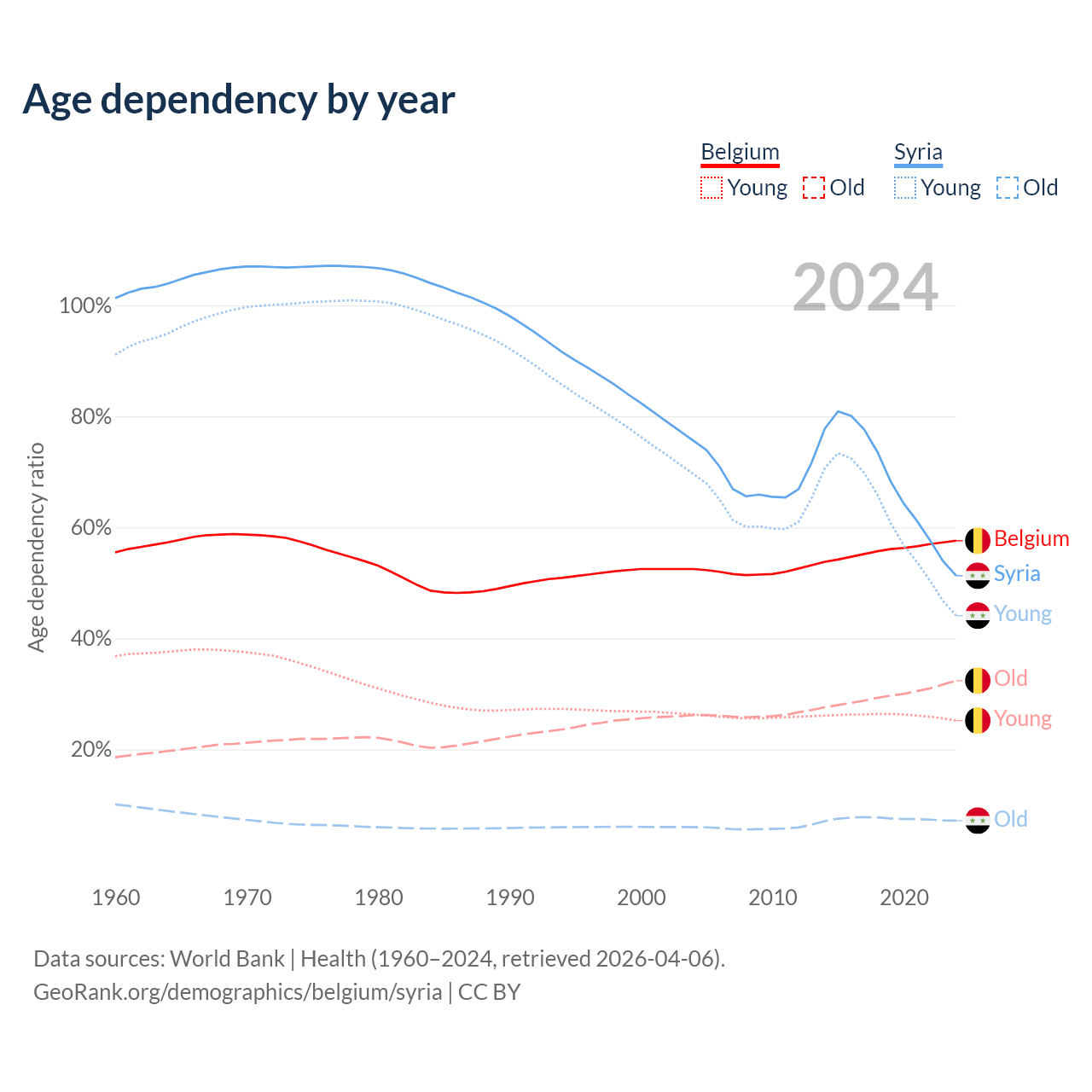 - The share of old-age demographic (65+) in Belgium is 20.6% vs 4.74% in Syria.