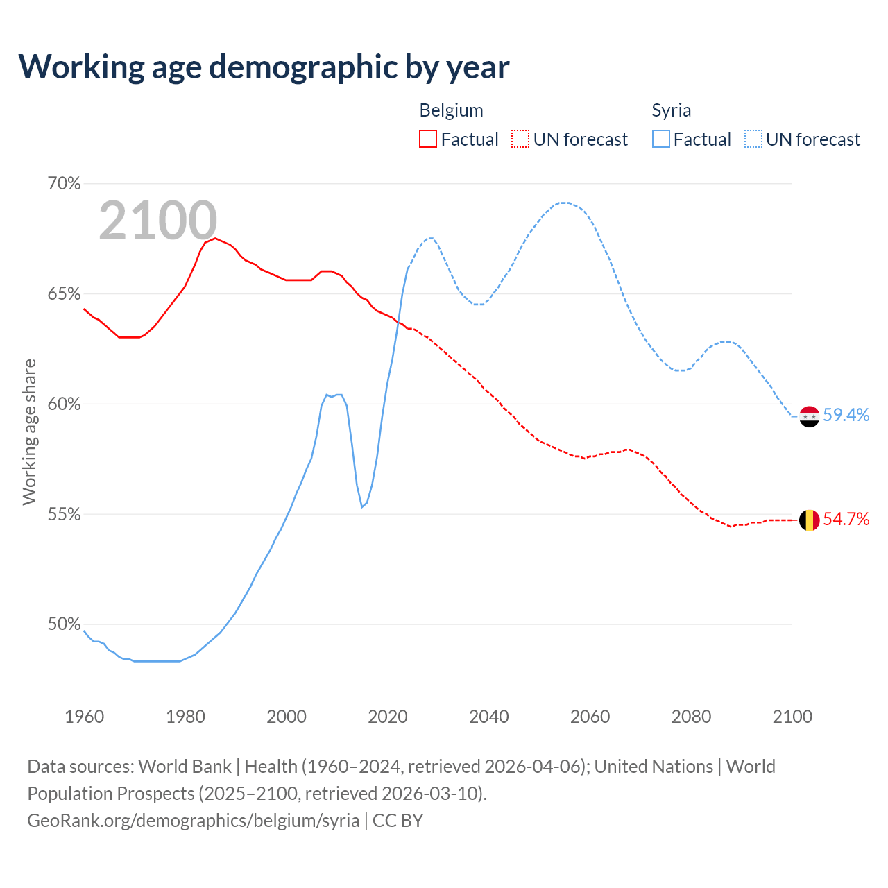 - Belgium has 7.55M working age adults (aged 15-64) vs 17.7M in Syria.