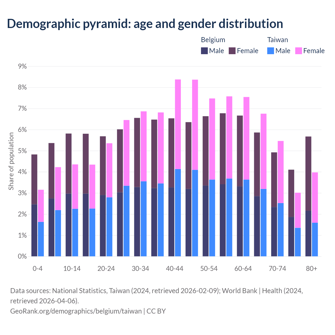 - Belgium is ranked 32/196 by median age (oldest to youngest) vs 16/196 for Taiwan.